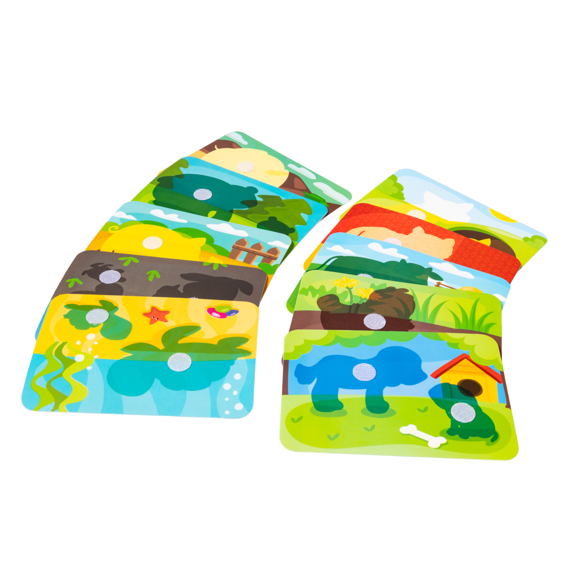 - Усложни задачу: расставь «малышей» и перемешай карточки со взрослыми животными — теперь ребёнок должен сам подобрать пару.