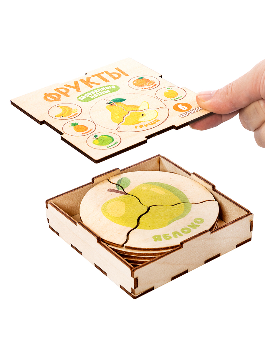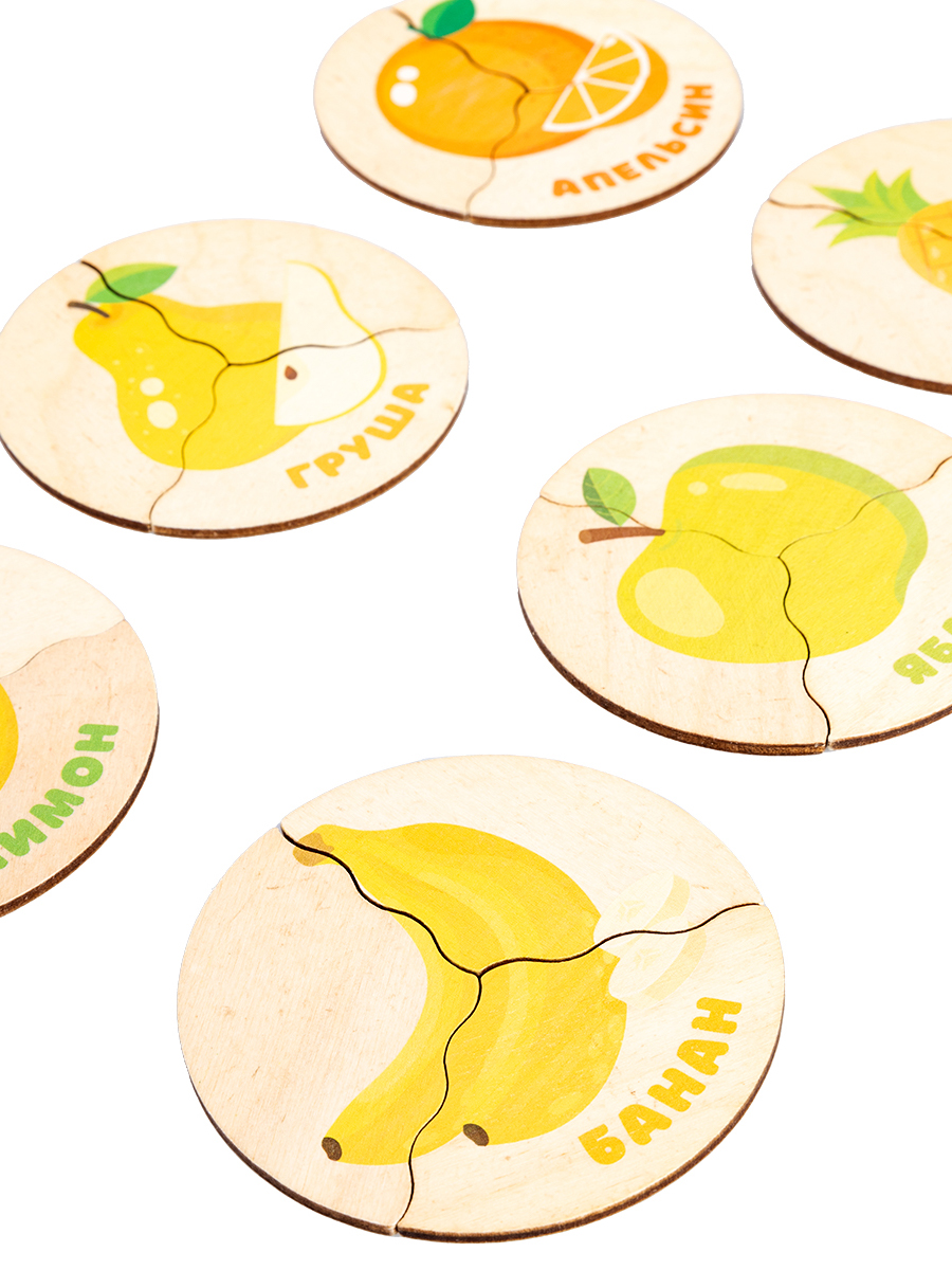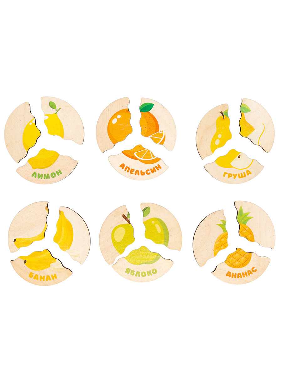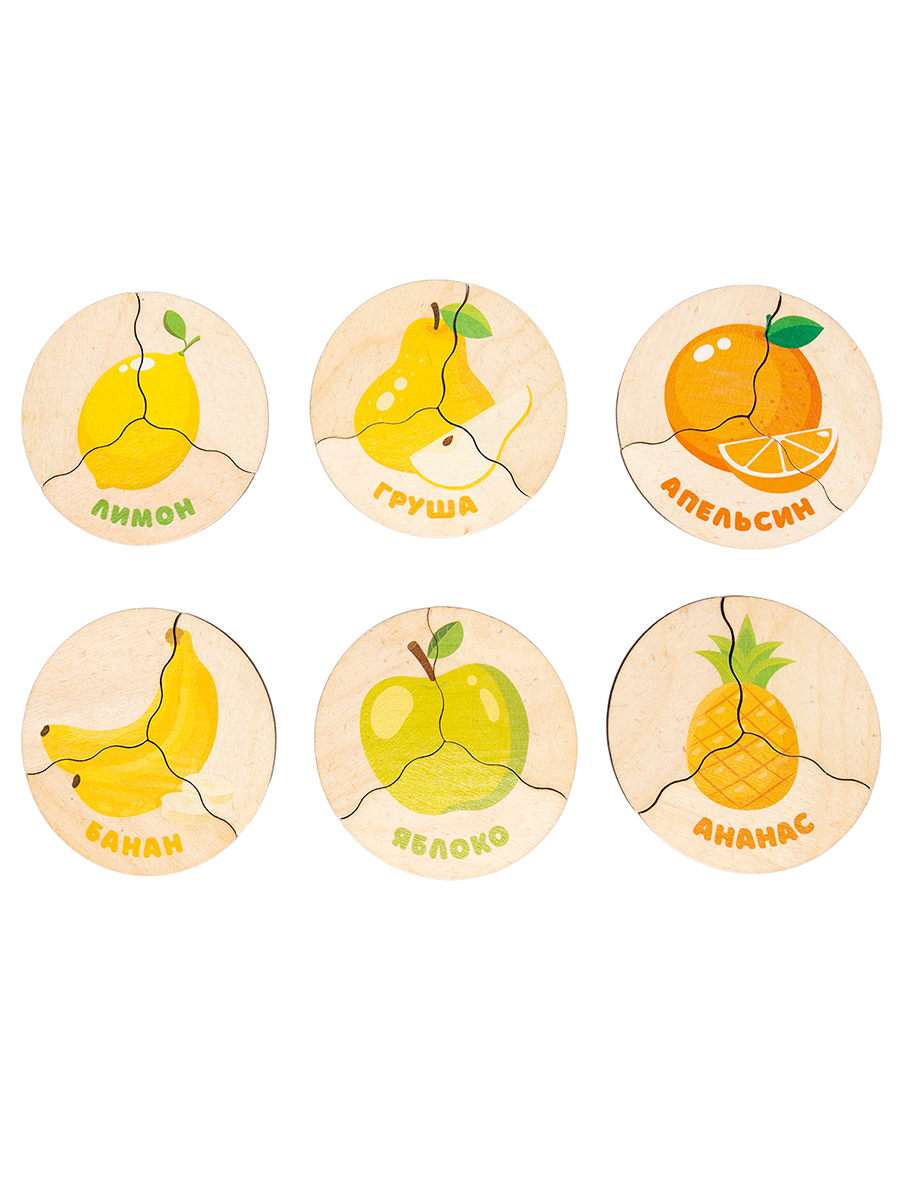 Экологичный игровой набор из березовой фанеры, созданный специально для самых маленьких. Набор включает 6 ярких картинок: ананас, банан, апельсин, груша, яблоко и лимон. Все детали тщательно обработаны и имеют скругленные края для безопасности ребенка.