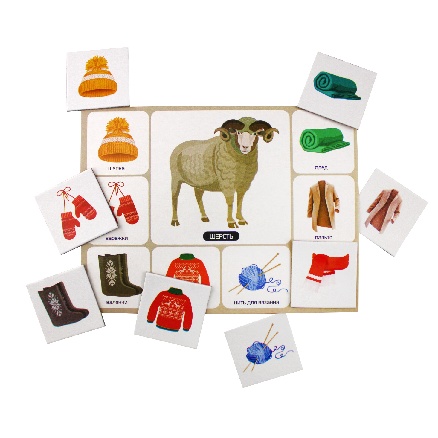 - Игрок должен сообразить, из чего сделан этот предмет (например, батон — из пшеницы, а свитер — из шерсти), и закрыть им соответствующее деление на своём поле.