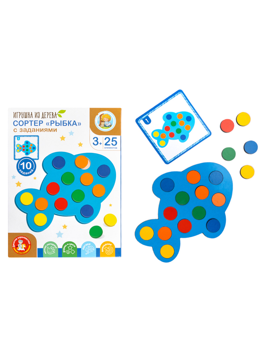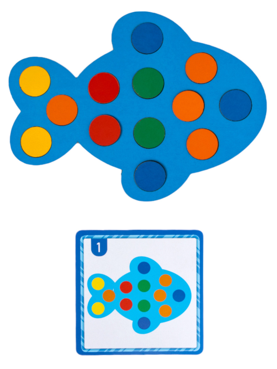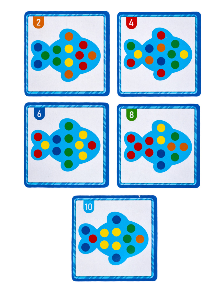 основание Рыбка, цветные кружочки 25 шт, двухсторонние карточки с заданиями 5 шт