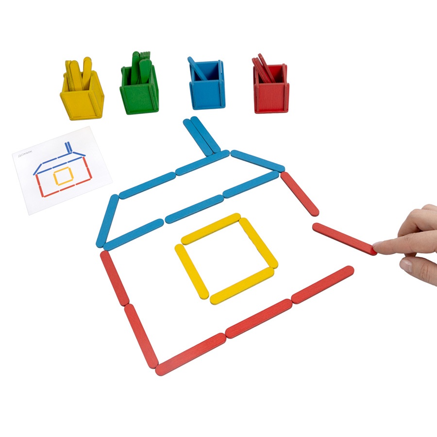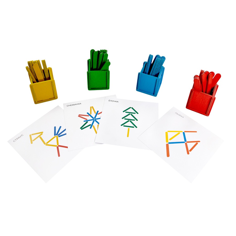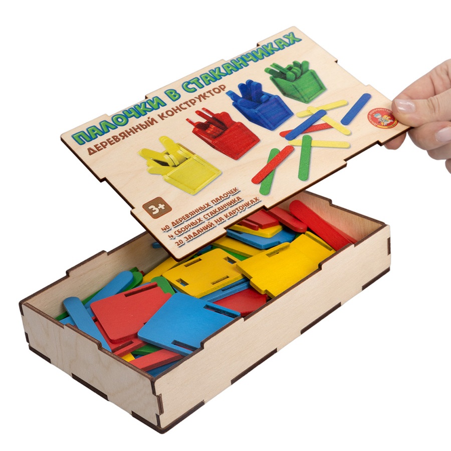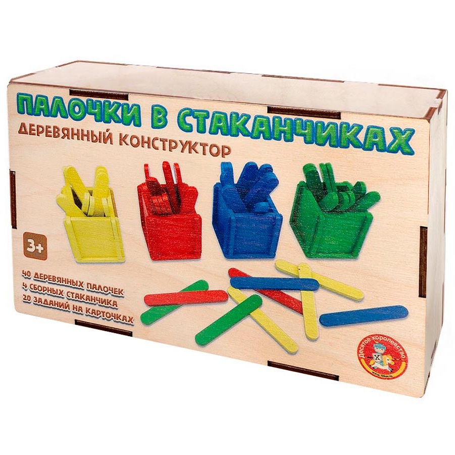 40 деревянных палочек, 4 сборных стаканчика, 20 заданий на карточках