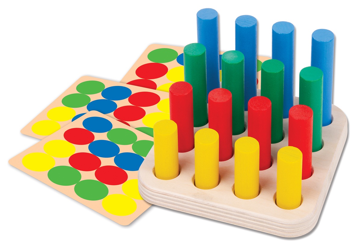 деревянное поле, деревянные столбики 4 цветов – 16 шт, двусторонние карточки с заданиями 3 шт