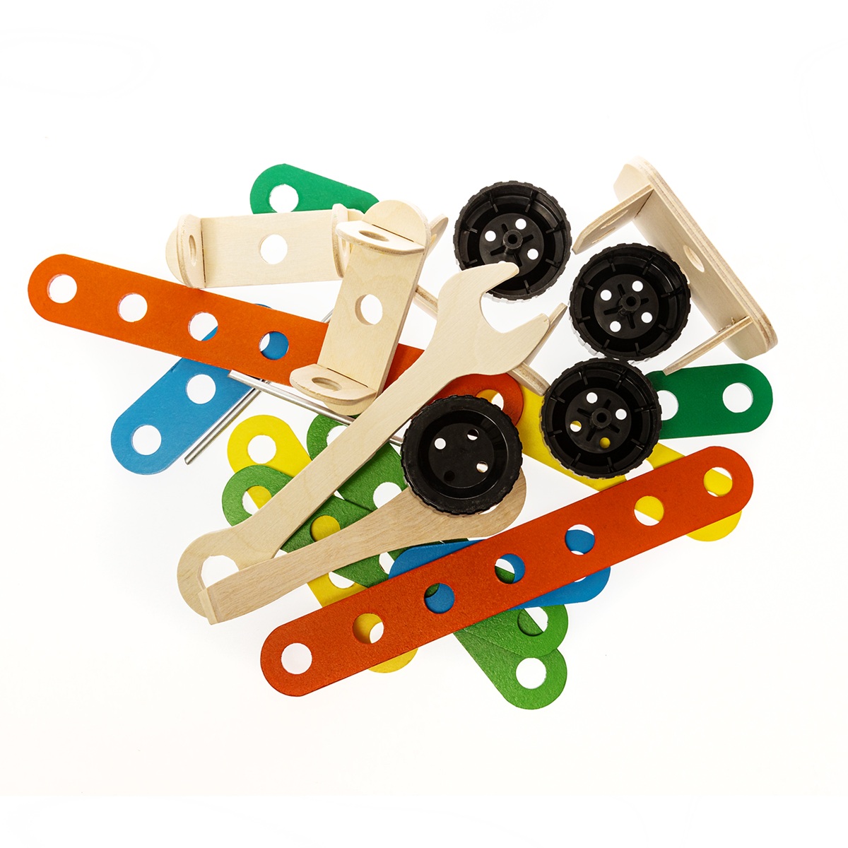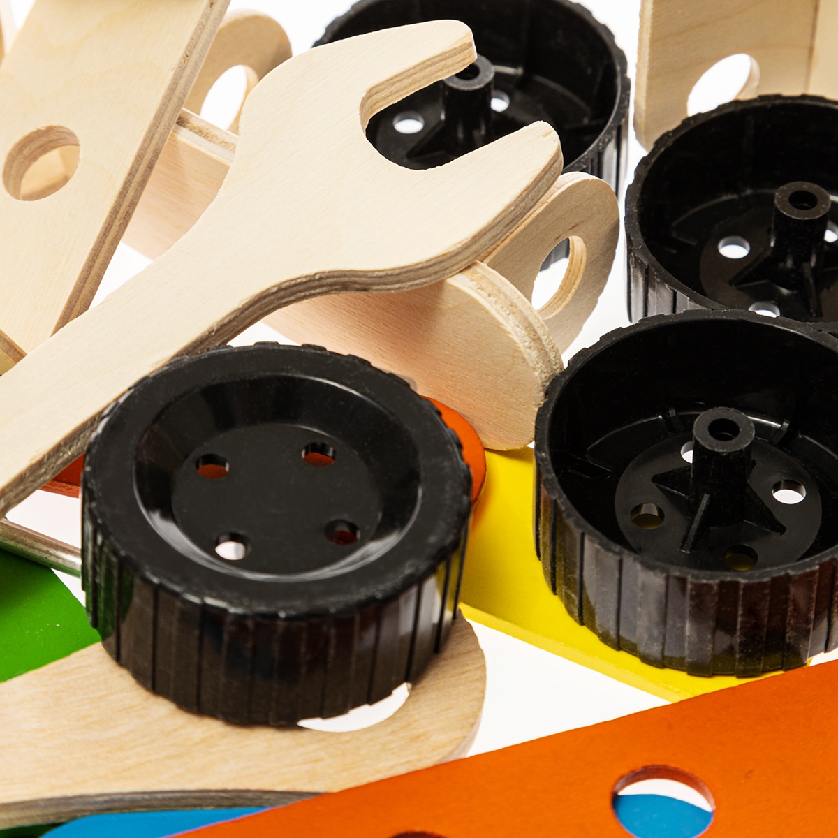 Все деревянные детали тщательно отшлифованы, что делает конструктор безопасным для детей. Благодаря продуманной системе поворотных винтов, собранная машина обладает функциональными вращающимися колесами, что добавляет игре реалистичности.