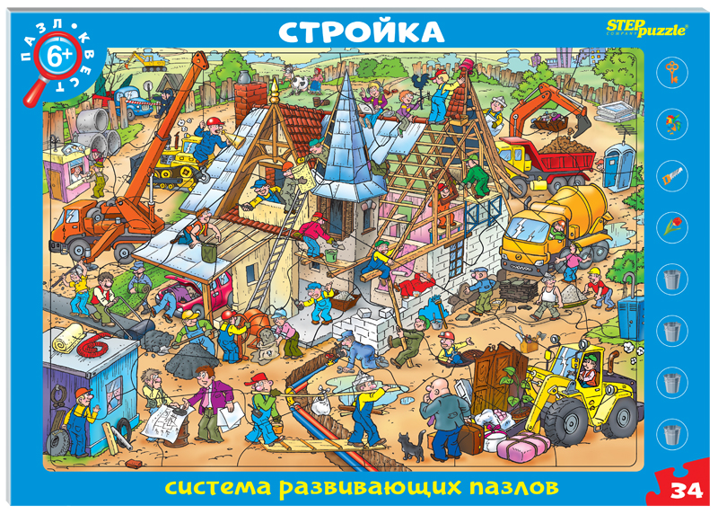 Развивающий пазл «Стройка» ориентирован на активное развитие речи, памяти, внимания, логического и образного мышления. В комплекте с пазлом идут фишки для дополнительной игры. Участникам нужно собрать пазл, затем внимательно рассмотреть рисунки на фишках. Эти рисунки следует найти на картинке пазла и положить сверху соответствующую фишку. Также на обратной стороне планшета приведена игра-кроссворд, все слова в котором составлены из букв слова «стройка».