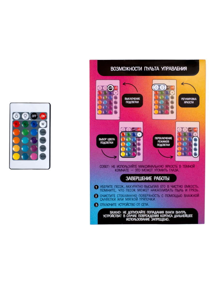 Рисование песком на стекле — это завораживающий процесс, который объединяет творчество и релаксацию. Благодаря встроенной подсветке и пульту управления, обычные песчаные узоры превращаются в эффектное световое шоу. Это отличный способ развить художественный вкус, мелкую моторику и снять эмоциональное напряжение.