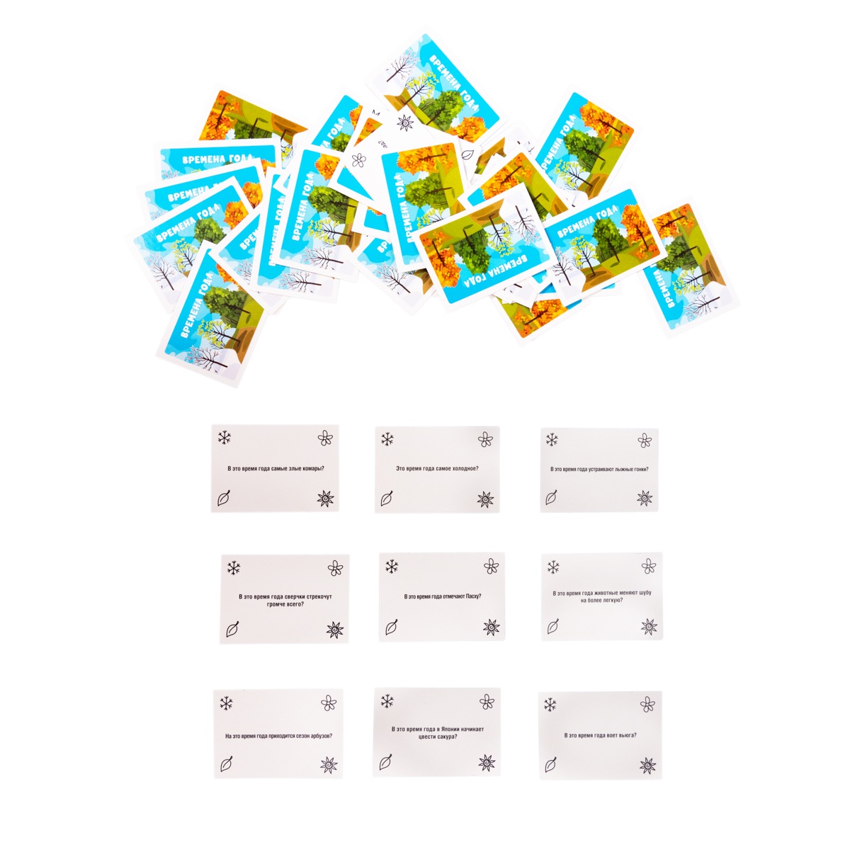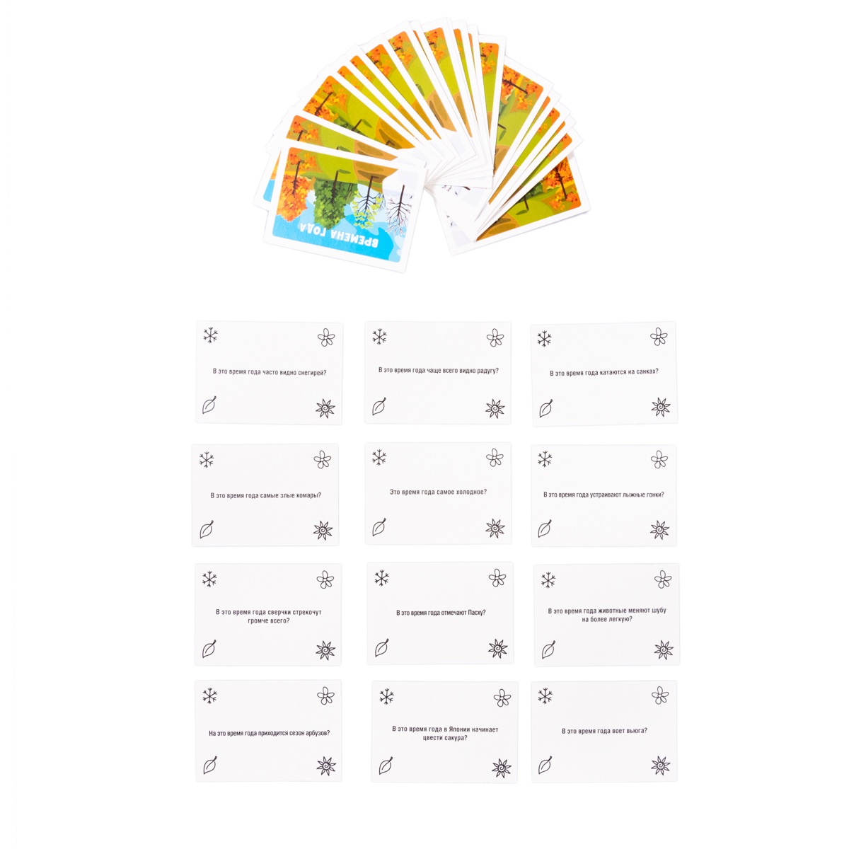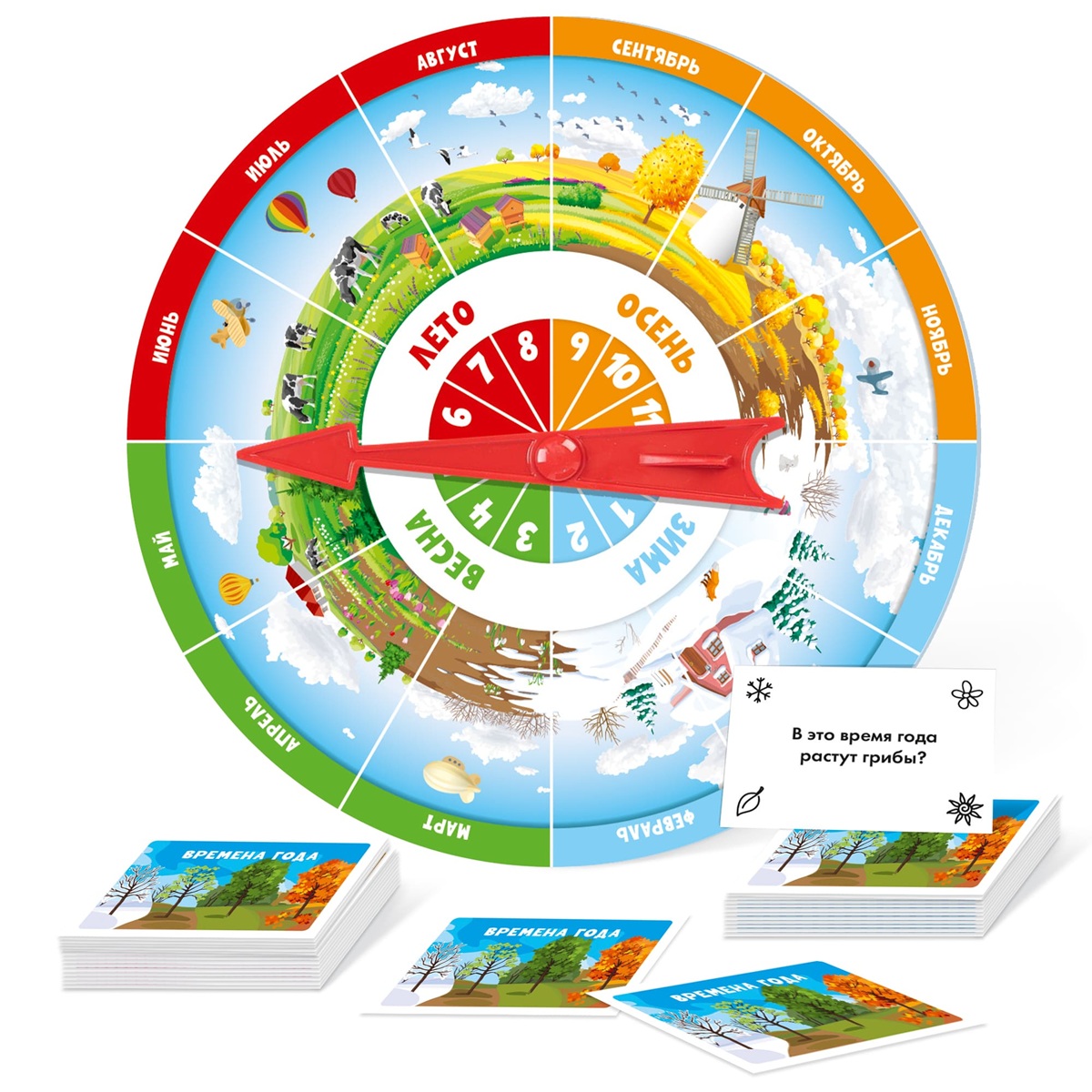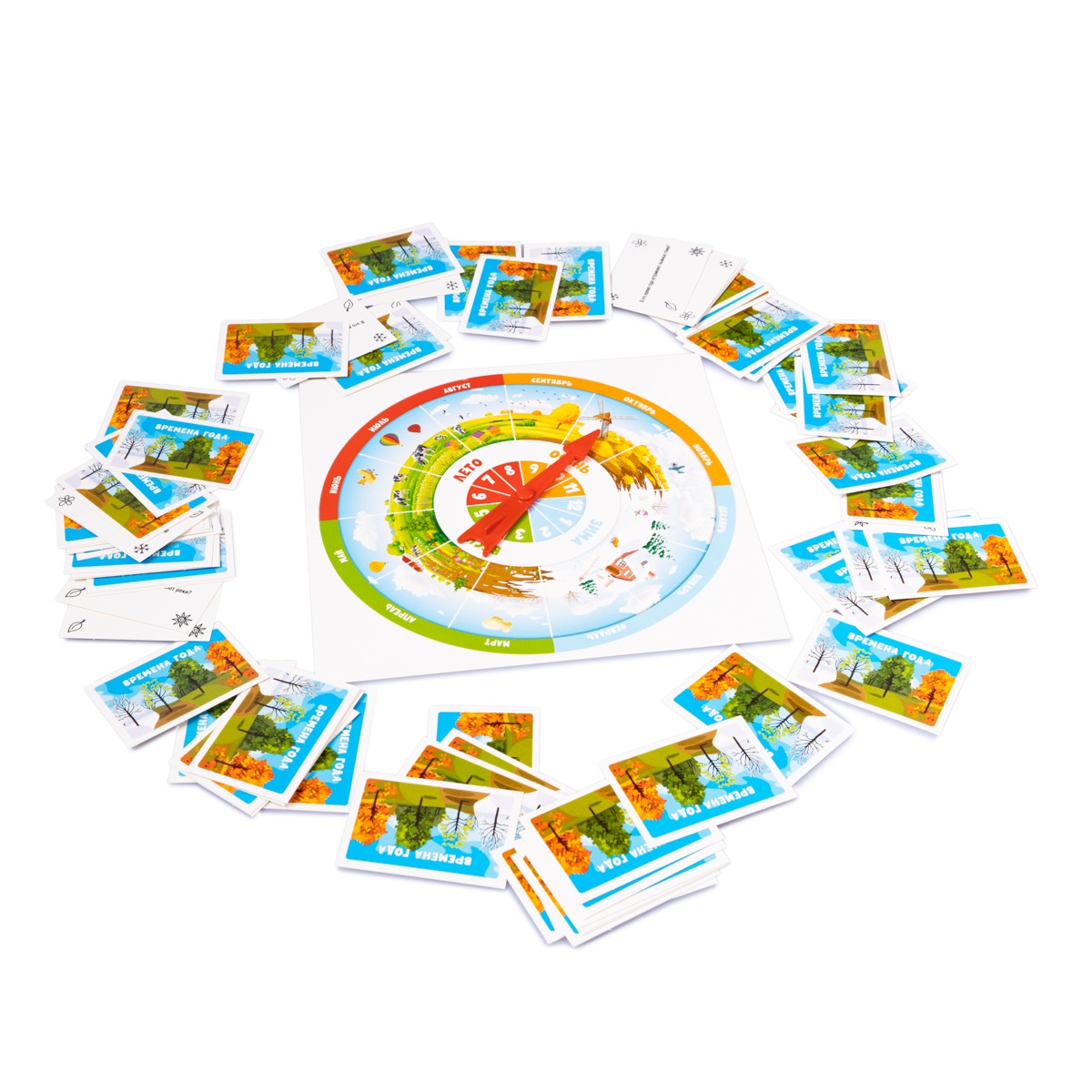 - Крутите стрелку на игровом поле. Когда она остановится, посмотрите на указанное время года и вытяните карточку из соответствующей стопки.