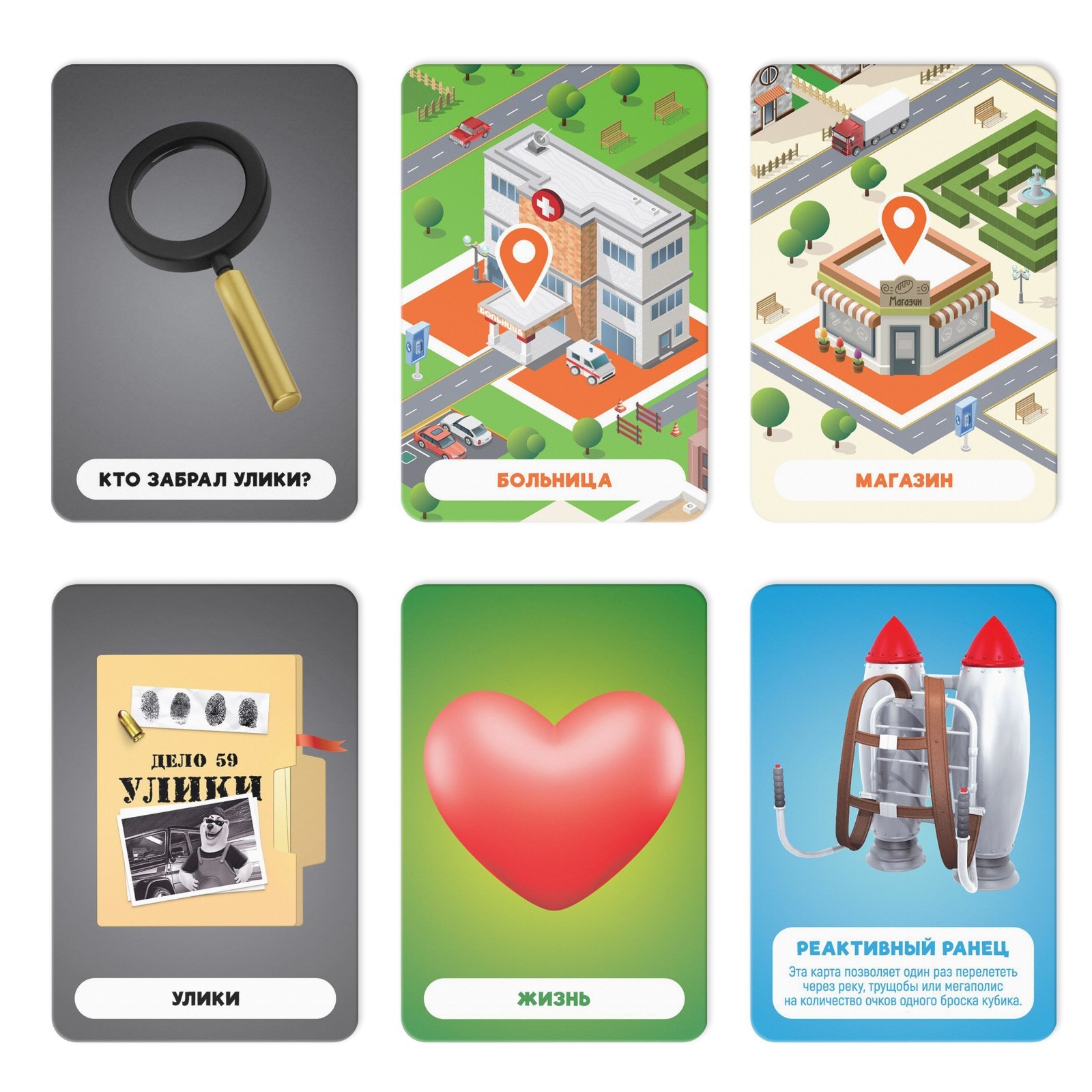 игровое поле, 50 карт, 1 кубик, 2 карты с фишками, правила игры
