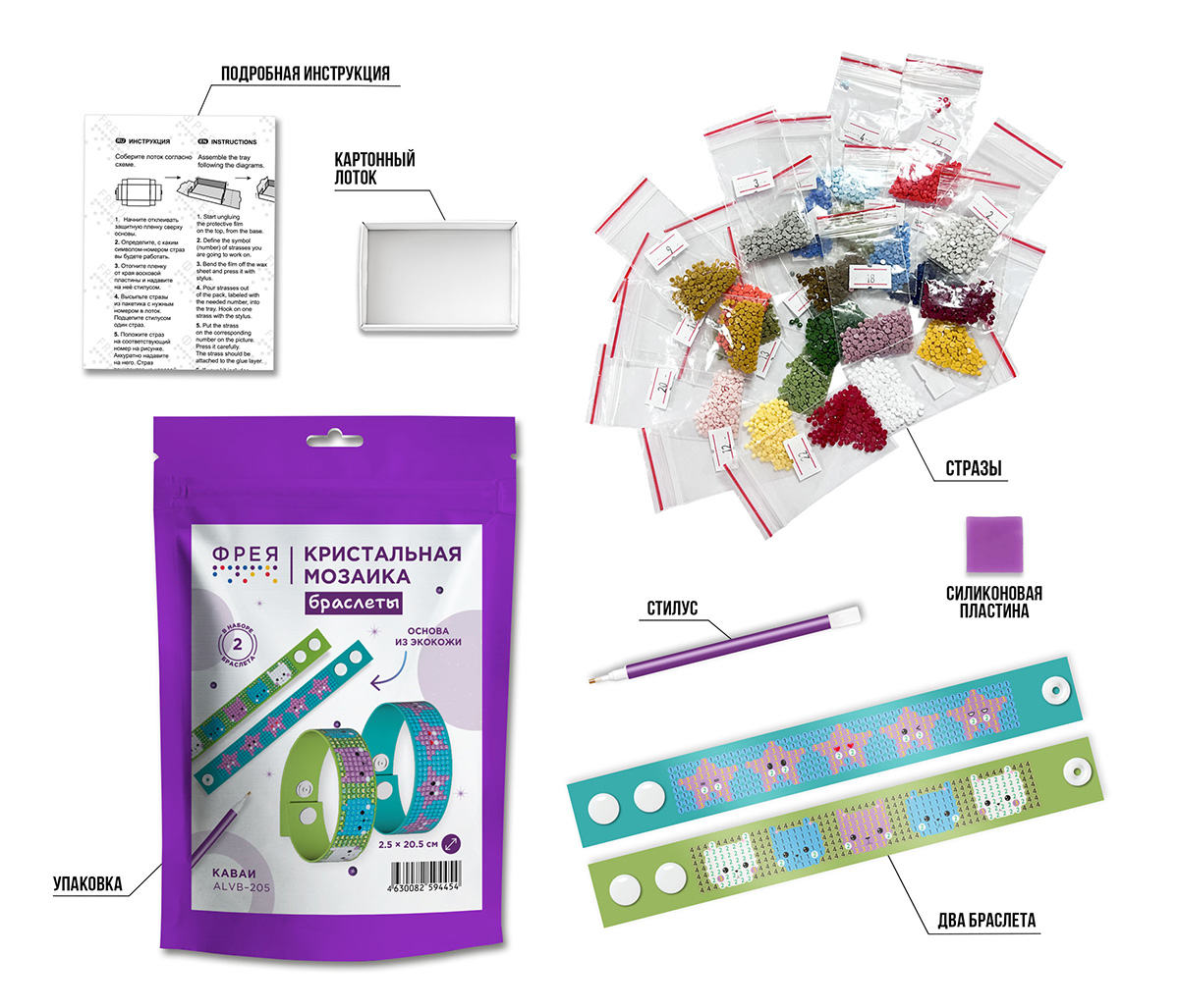 - Комплектация: В набор входит всё необходимое для творчества: основа из искусственной кожи, стилус, силиконовая пластина, картонный лоток, инструкция и круглые стразы с запасом более 20%.