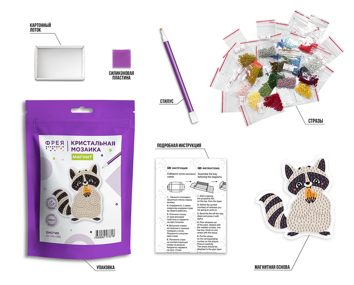 Набор для создания магнита в технике «Кристальная мозаика» — это увлекательное занятие для детей и взрослых, которое позволяет своими руками создать яркое украшение для дома. Процесс выкладки не требует специальных навыков и проходит легко и быстро, а результат порадует своей красотой и блеском.