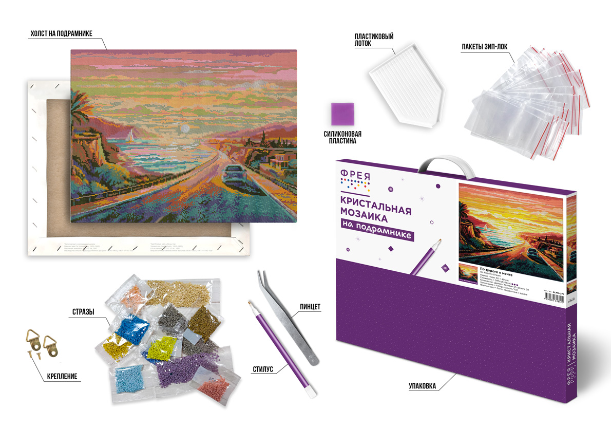 Набор для создания картины в технике «Кристальная мозаика» — это возможность своими руками создать сверкающий шедевр, который станет ярким украшением вашего дома. Холст уже натянут на прочный деревянный подрамник, поэтому вам не придётся оформлять готовую работу в багет, её можно сразу повесить на стену или поставить на полку.