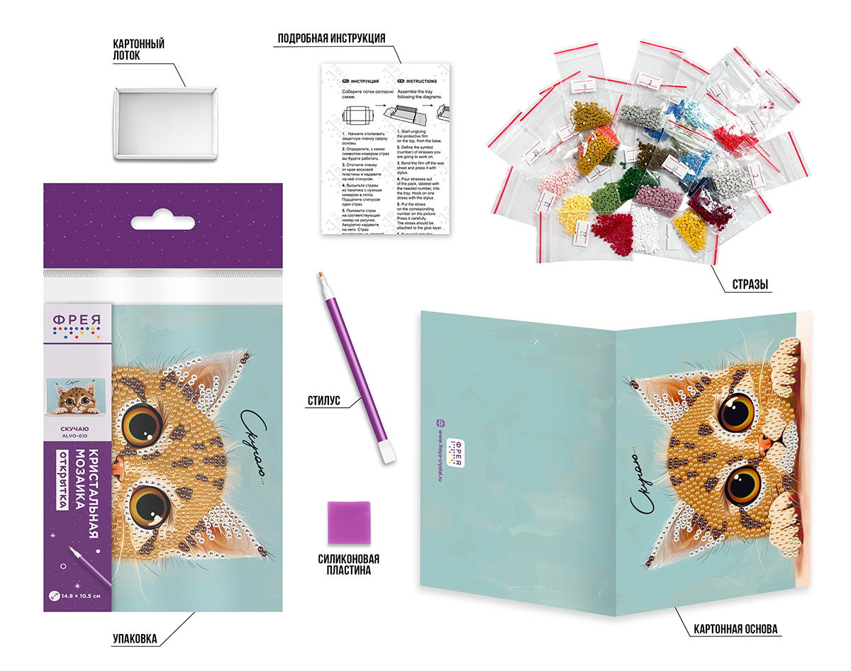- Простота и доступность: Набор подходит для начинающих. Стразы легко приклеиваются поверх нанесенной схемы на открытке, что делает процесс творчества приятным и доступным.