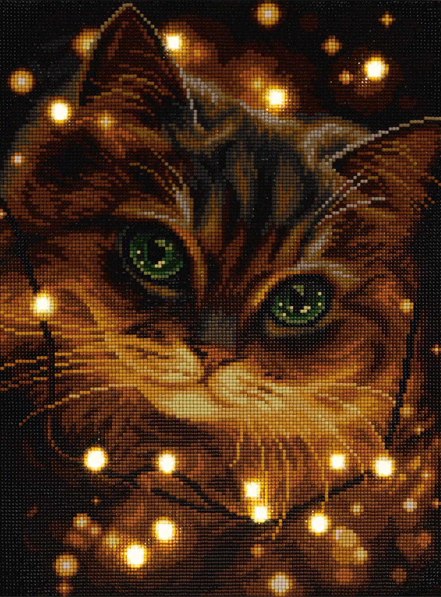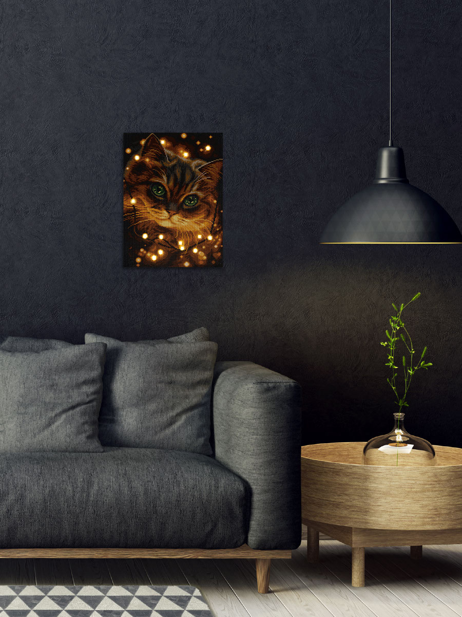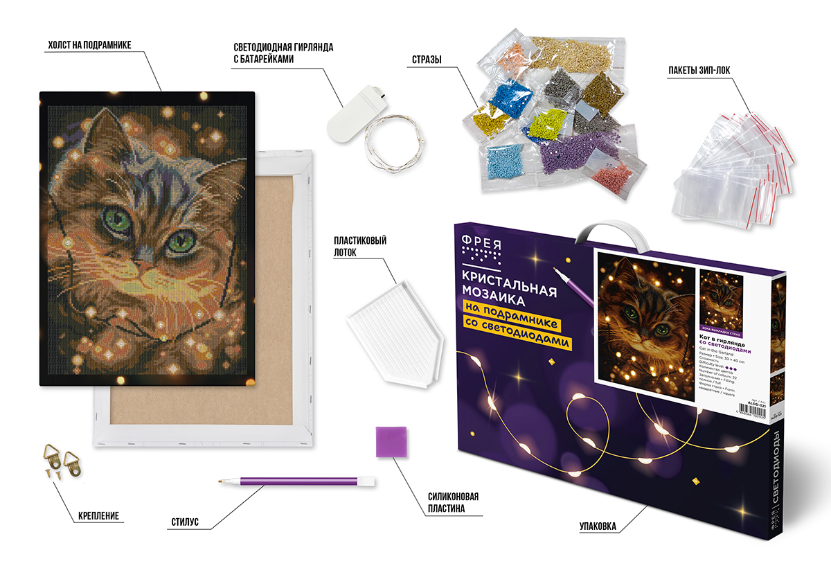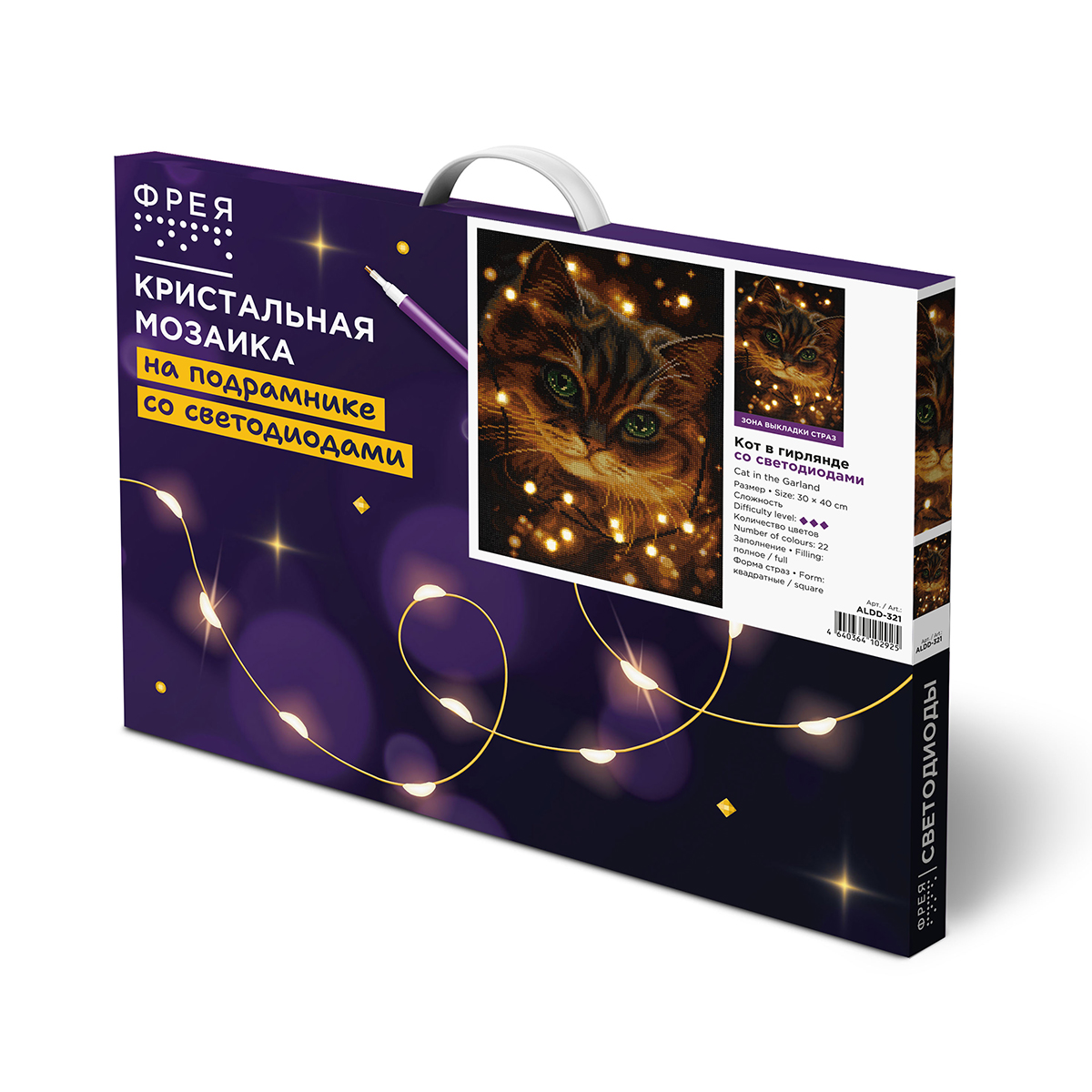 Новая серия наборов для алмазной мозаики с встроенными светодиодами! Готовая картина станет еще эффектнее, так как светодиодная гирлянда добавляет блеск, объем и уютное свечение (теплый свет). Холст уже натянут на деревянный подрамник с подложкой, исключая провисание и необходимость оформления в багет. Стразы меньшего размера обеспечивают более детальное и реалистичное изображение.