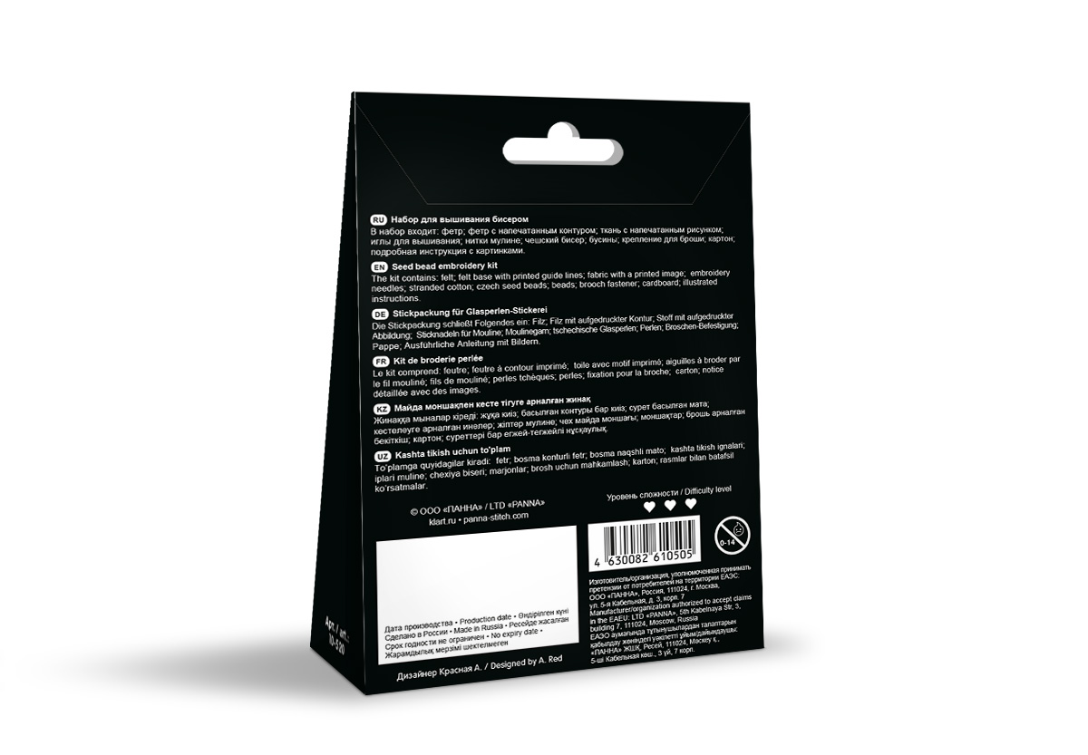В набор для вышивания Klart входит: хлопковая ткань с нанесенным контуром, фетр с нанесенным контуром, фетр для оформления оборотной стороны броши, картон, чешский бисер, бусины, хлопчатобумажные нитки мулине Gamma, тонкая игла для вышивания бисером Gamma, крепление для броши, подробная инструкция с цветными иллюстрациями.