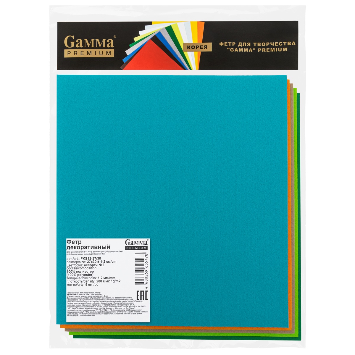—Набор фетра GAMMA Premium 1.2 мм 5 шт 27 х 30 ± 2 см ассорти №2 FKS12-27/30-2
