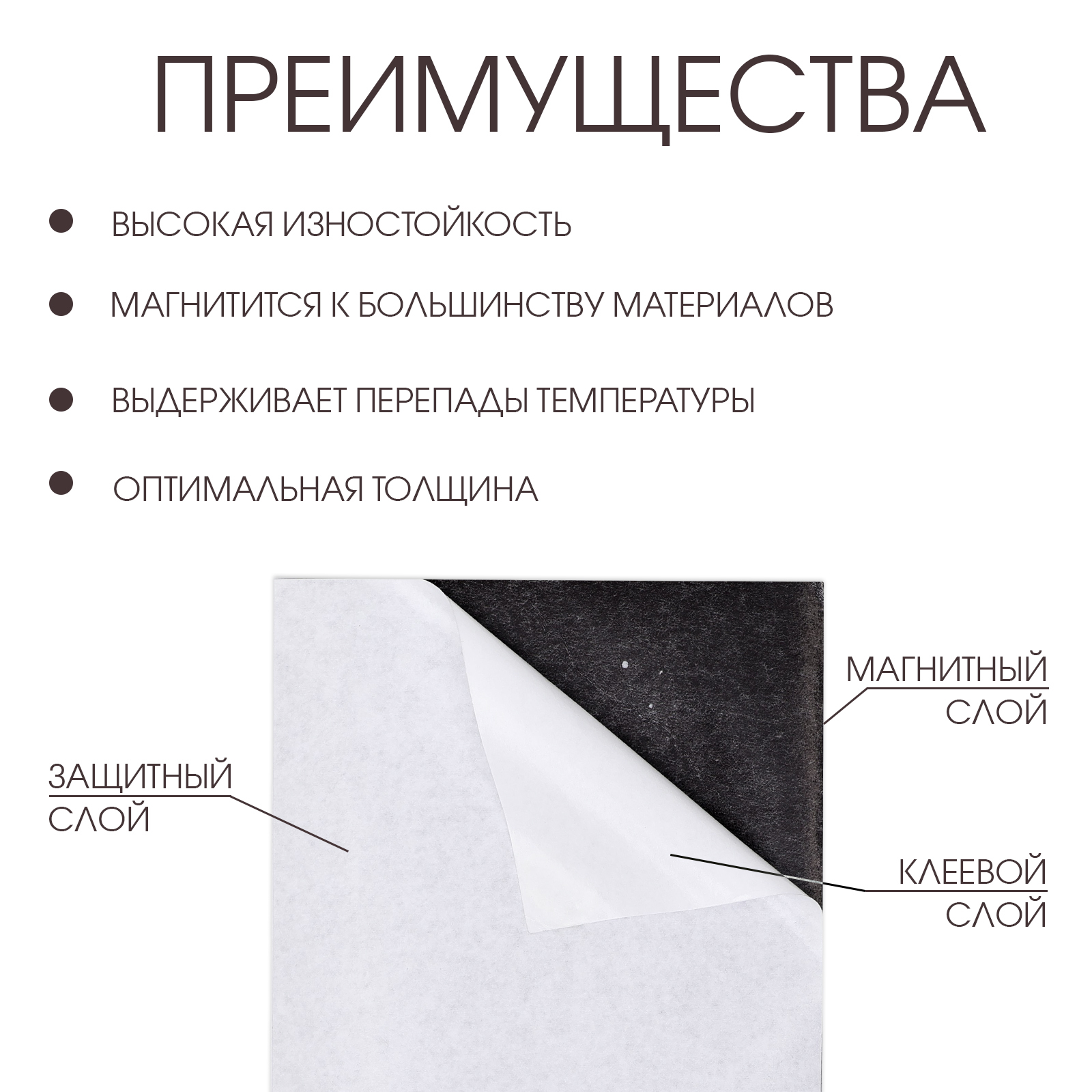 - Магнитный винил, примагниченный к обычной магнитной доске, легко удерживает приклеенное к нему изделие весом до 300 г (при равномерно распределённой нагрузке).