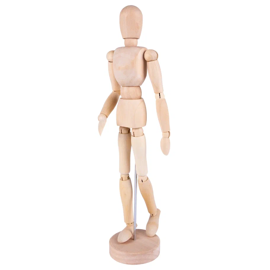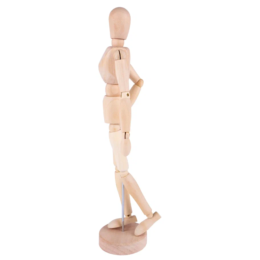 Деревянный манекен человека высотой 30 см предназначен для художников и иллюстраторов, которым необходимо детально проработать пропорции и естественные позы в своих зарисовках. Шарнирные соединения в местах суставов позволяют точно имитировать движения человеческого тела, придавая фигуре практически любое положение. Это помогает понять механику движений и правильно распределить свет и тень на рисунке.