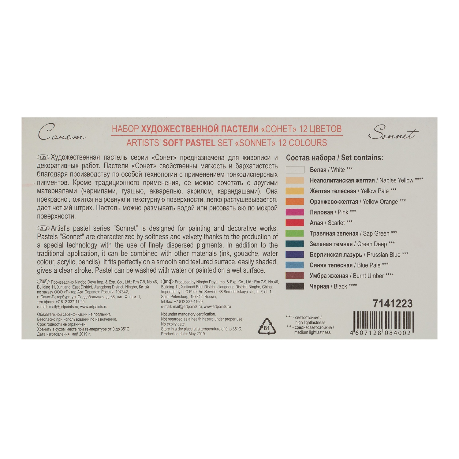 Сухая мягкая пастель «Сонет» создана по технологии, использующей тонкодисперсные пигменты. Это обеспечивает материалу его главные качества: легкость нанесения и бархатистость штриха. Компактный набор из 12 цветов содержит базовую палитру, необходимую для создания полноценных работ, выполнения быстрых набросков или добавления цветовых акцентов в смешанных техниках. Пастель отлично ложится на бумагу и легко растушевывается, позволяя создавать мягкие дымчатые эффекты и плавные переходы.