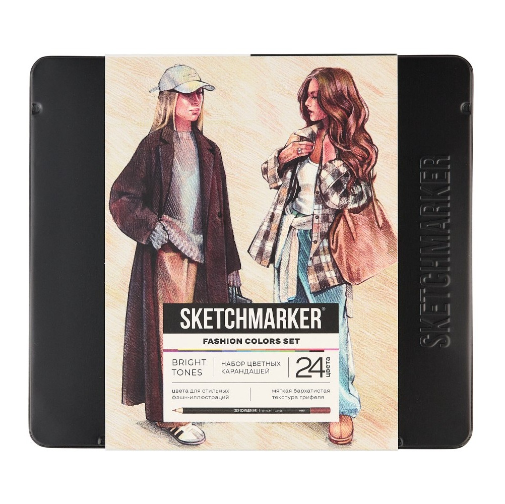 Sketchmarker Bright Tones Fashion Set — это продуманная подборка из 24 оттенков, созданная специально для модельеров, стилистов и fashion-иллюстраторов. Грифель на масляной основе диаметром 4 мм обеспечивает мягкое нанесение и позволяет детально передавать фактуру тканей: от нежного шелка до плотной костюмной шерсти. Благодаря способности к наслоению, вы сможете легко создавать плавные переходы цвета, передавать игру света на одежде и прорисовывать естественные тона кожи.