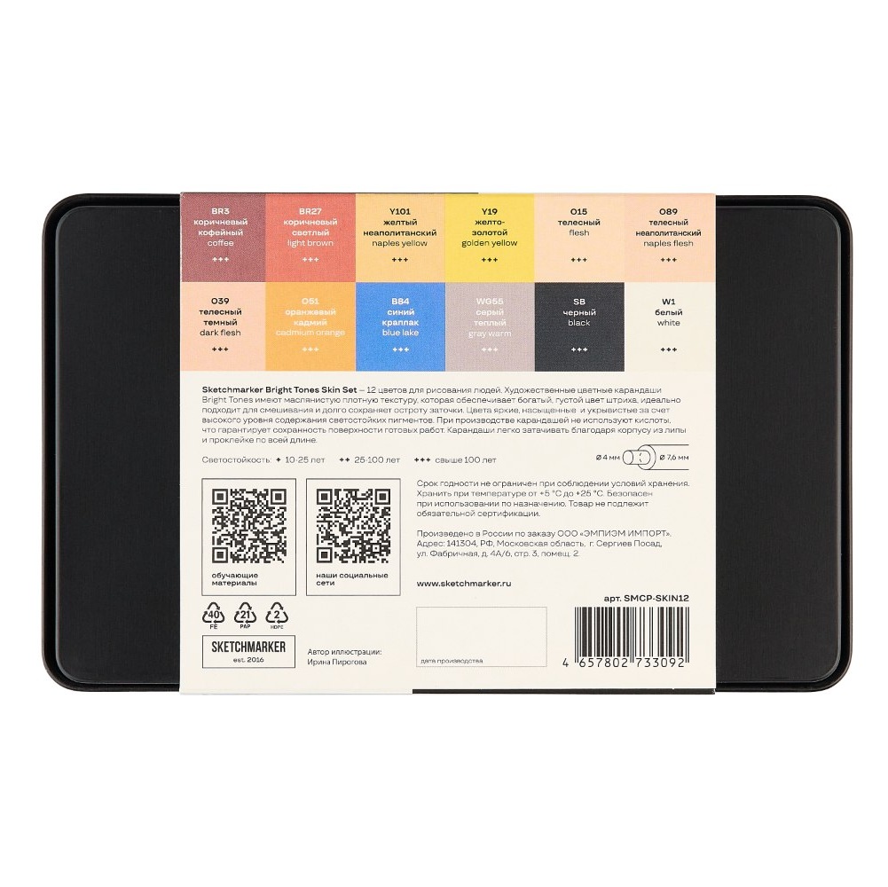 Sketchmarker Bright Tones Skin Set — это экспертная подборка из 12 оттенков, созданная для максимально реалистичной передачи тонов кожи, создания портретов и рисования людей. Грифель на масляной основе диаметром 4 мм обеспечивает мягкое нанесение и превосходную смешиваемость, что позволяет художнику добиваться тончайших цветовых нюансов, мягких теней и естественных румян. Благодаря плотному покрытию и возможности многослойного наложения, вы сможете легко передать объем лица и мягкость кожи.