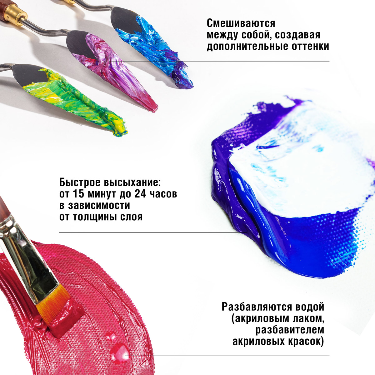 - Разбавляется водой, акриловым лаком, разбавителем акриловых красок и т.п.;