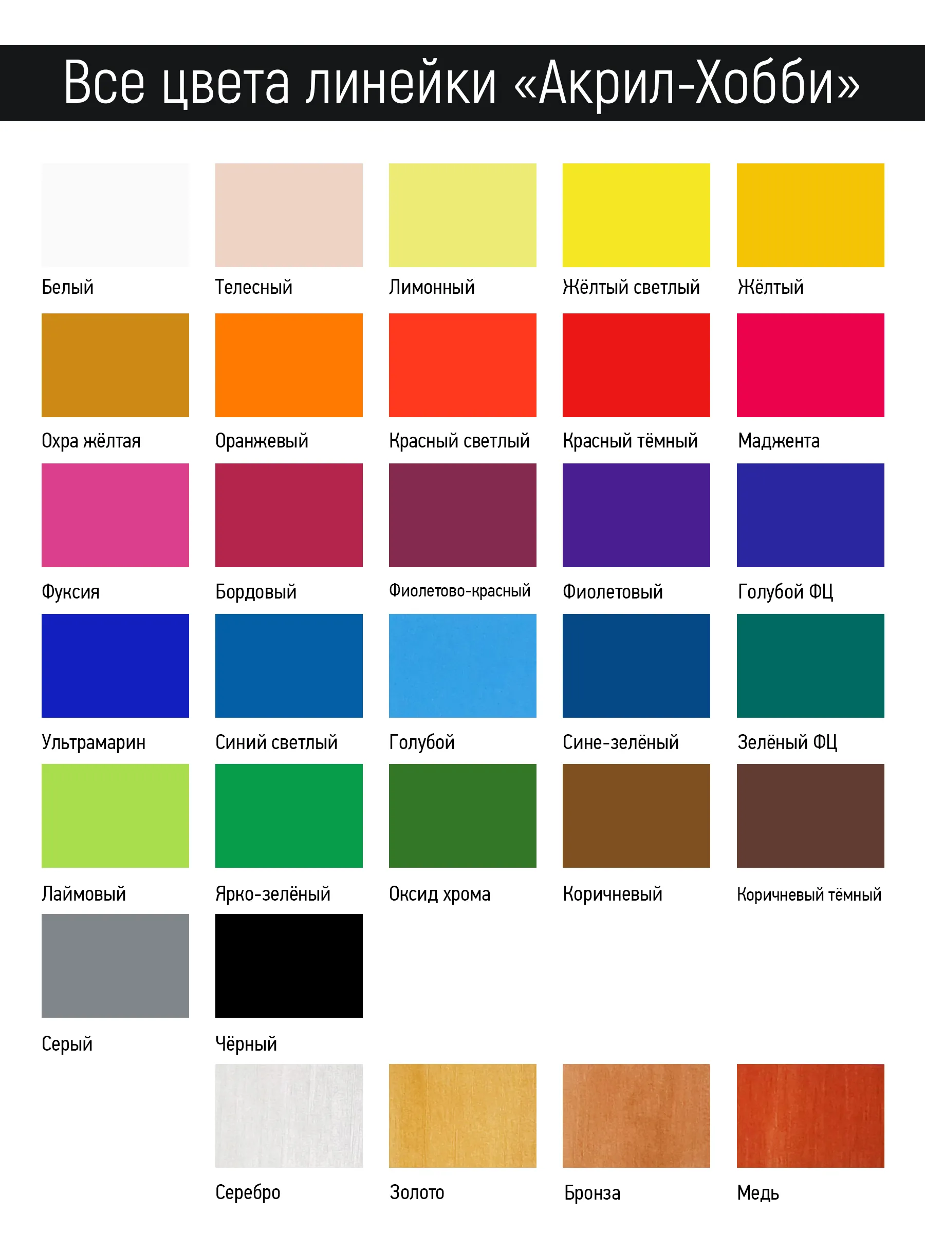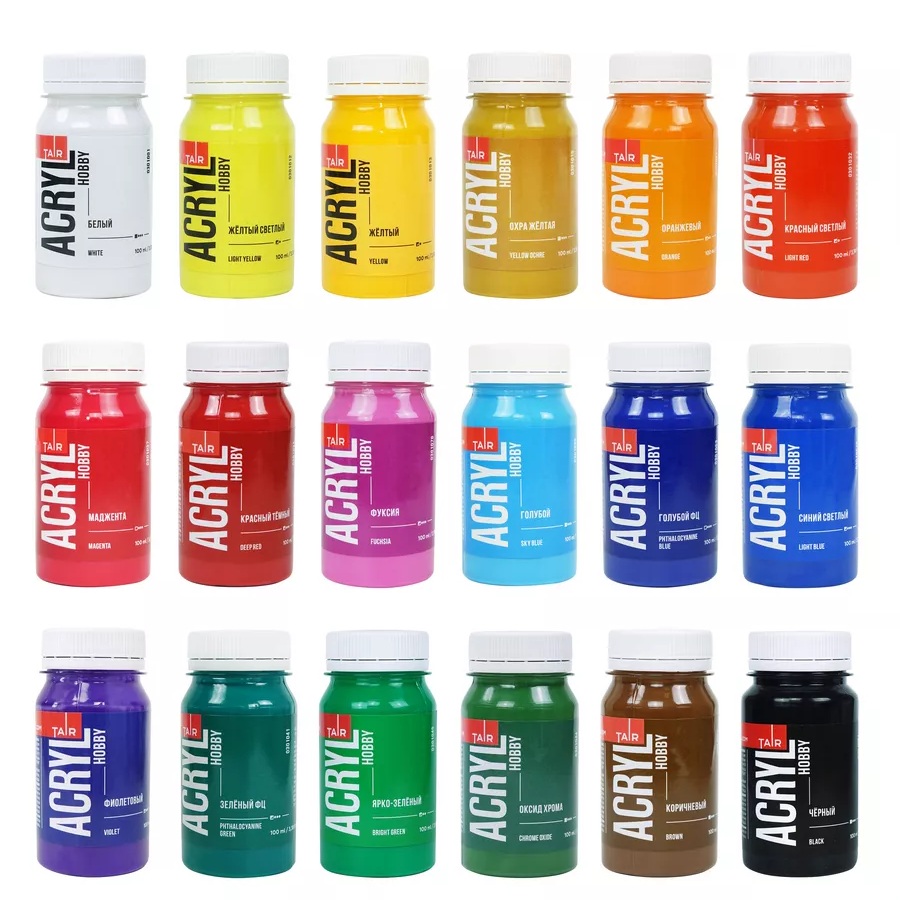 Краски Акрил-Хобби — это яркая палитра матовых красок и несколько оттенков «металлик». Краски разбавляются водой, мягкие и кроющие по консистенции. После высыхания не растворимы водой. Превосходно подходят для декоративно-прикладных, интерьерных и дизайнерских работ, различных видов творчества, в том числе и детского.