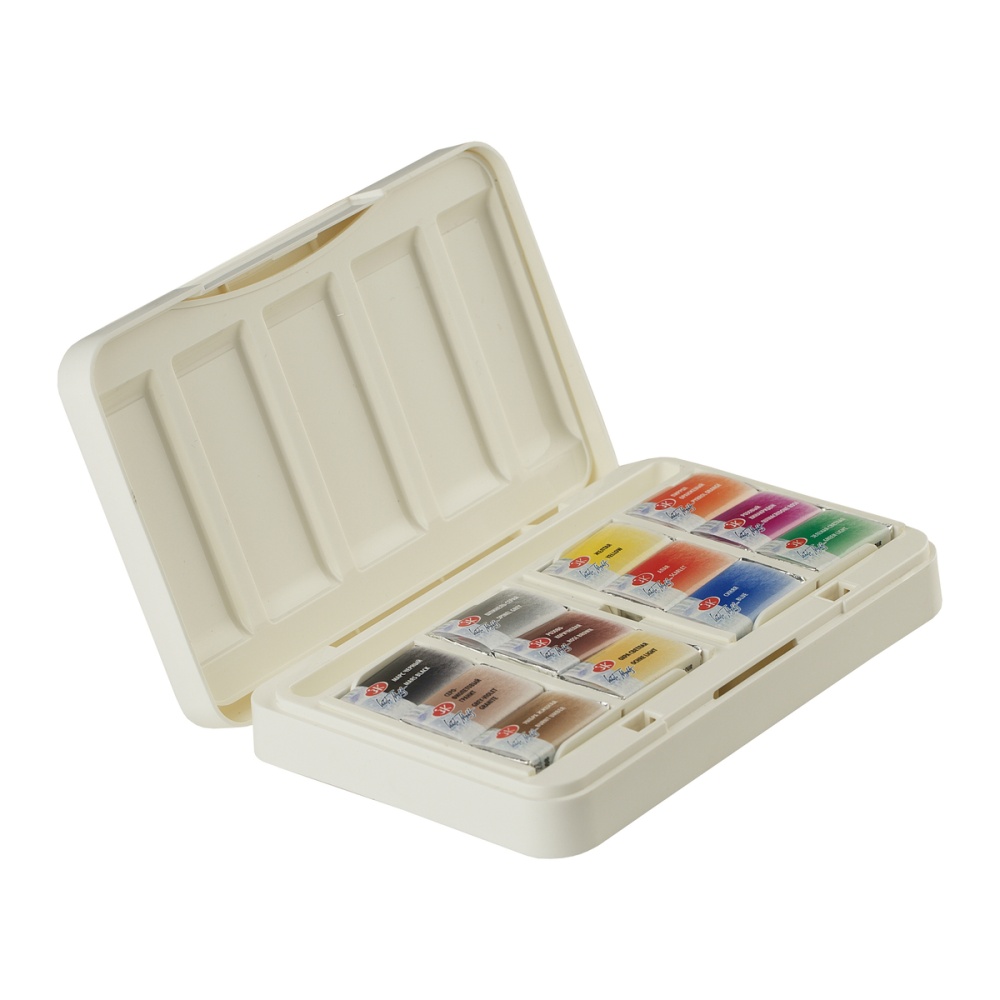 Набор комплектуется в компактный пластиковый пенал со съемной палитрой и отделением для дорожной кисти. Съемные кассеты для кювет облегчают уход за пеналом.