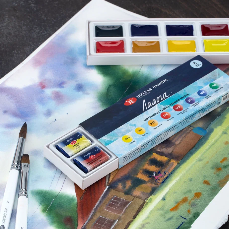 Набор акварельных красок «Ладога» в компактном формате — идеальный выбор для пленэров и летней практики. Базовая палитра из 8 основных цветов разработана специально для учебных задач, помогая начинающим художникам освоить колористику и технику смешивания красок.