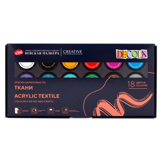 Набор акриловых красок по ткани DECOLA содержит 18 банок по 20 мл