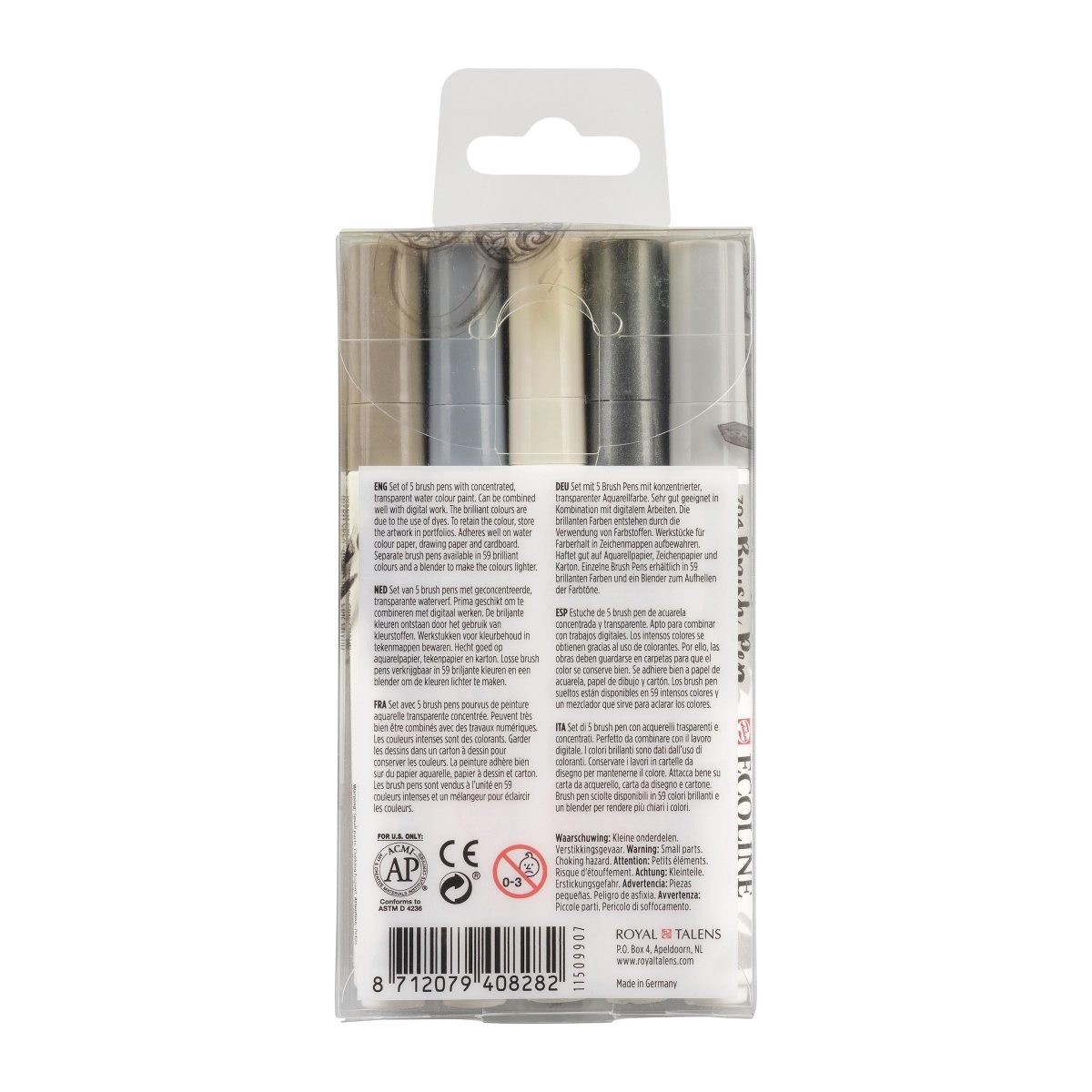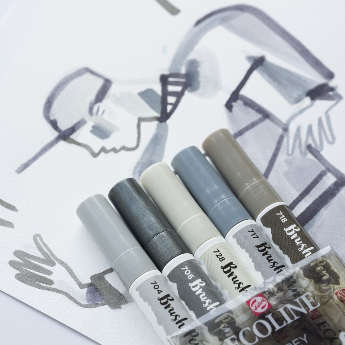 Набор акварельных маркеров Brush Pen из серии Ecoline от голландской фирмы Royal Talens представляет собой концентрированную жидкую акварель в максимально удобном формате. Данная подборка, состоящая из пяти серых оттенков разной тональности, является незаменимым инструментом для создания теней, объема в архитектурном скетчинге, глубины в иллюстрации и строгой графики в каллиграфии. Благодаря чистому составу на основе красителей и гуммиарабика, цвета ложатся ровным прозрачным слоем, сохраняя яркость и выразительность.