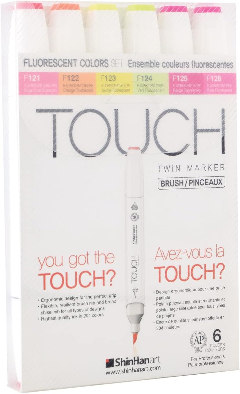Набор спиртовых маркеров ShinHan Art Touch Brush Fluorescent, 6 шт — коллекция неоновых оттенков с гибким пером-кистью.