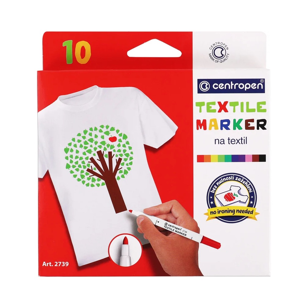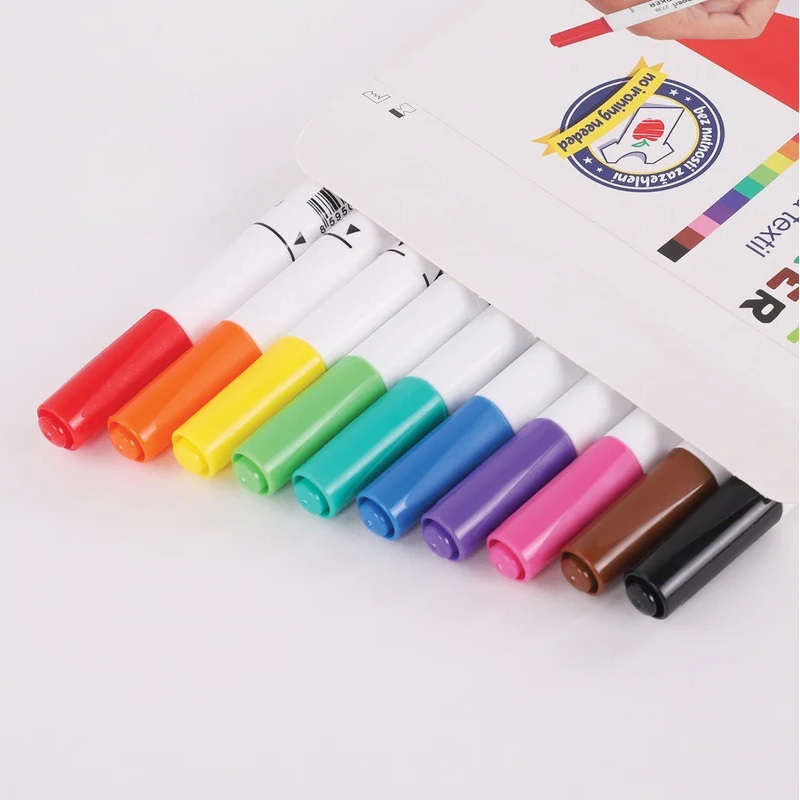 Набор маркеров с эргономичной зоной захвата, 10 цветов. Для рисунков, надписей на текстильных изделиях. Светостойкие пигментные чернила, не смываемые при стирке до 60 градусов. Не гладить утюгом. Пулевидный наконечник, толщина линии 1,8 мм. Хранить в горизонтальном положении.