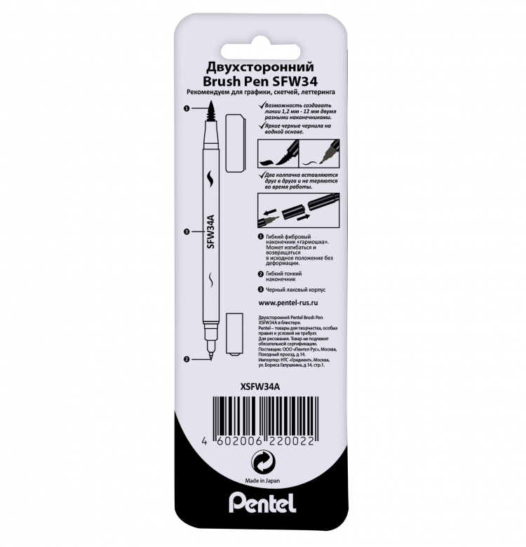 Pentel SFW34 — это уникальный двухсторонний инструмент, созданный для художников, которые ценят экспрессию и надежность. Главной особенностью брашпена является инновационный фибровый наконечник со структурой «гармошки», который способен изгибаться до 90 градусов без деформации. Это позволяет художнику мгновенно переходить от тончайших штрихов к сверхшироким мазкам, создавая динамичные живые линии, которые невозможно получить обычным фломастером. Насыщенные черные чернила на водной основе ложатся плотным слоем, идеально подходя для леттеринга, глубоких теней в скетчинге и эффектных каллиграфических работ.