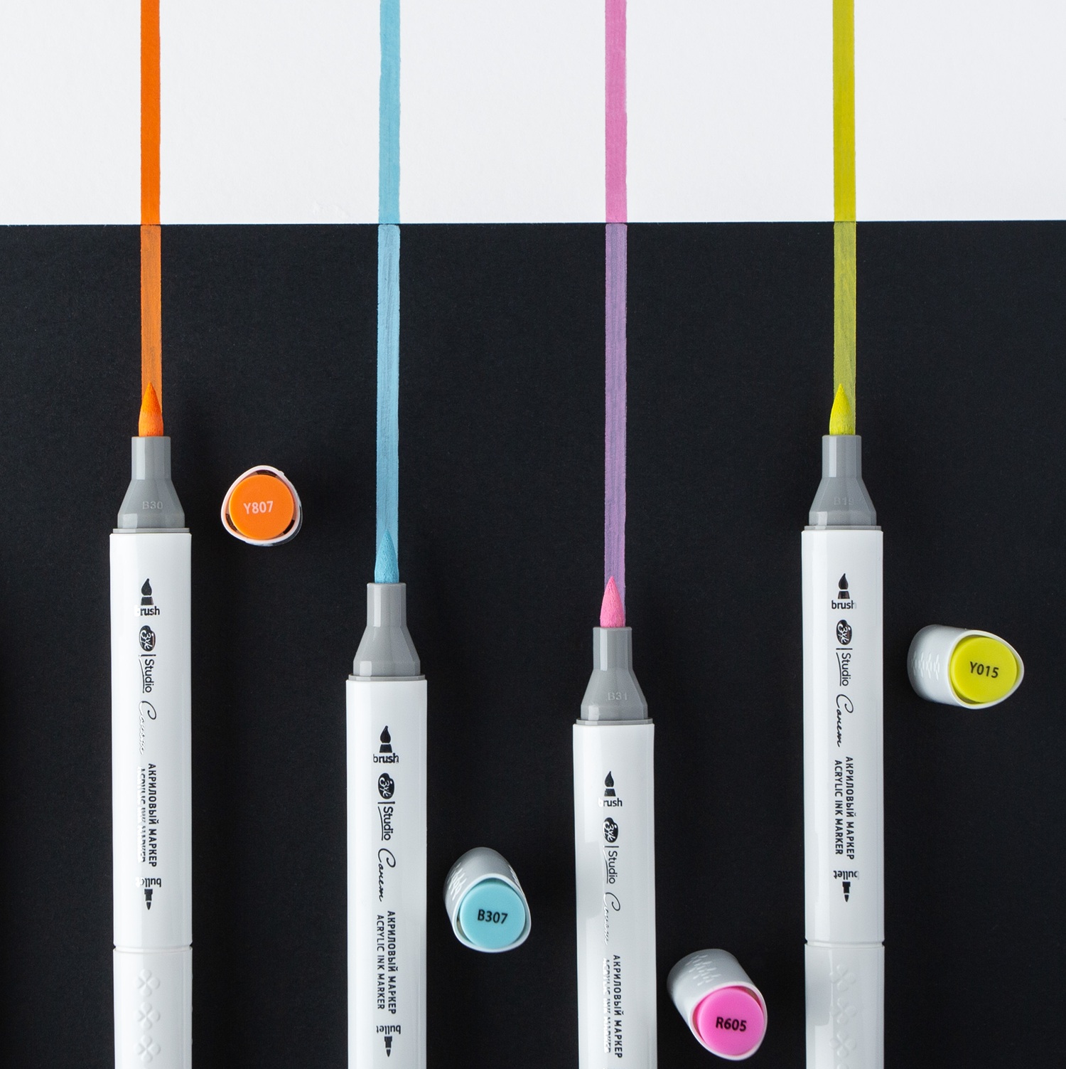 Уникальность модели заключается в наличии двух типов наконечников. Упругое перо-кисть позволяет гибко управлять толщиной штриха, имитируя живописные мазки, в то время как перо-пуля незаменимо для четкой детализации и тонких контуров. Пока краска остается влажной, цвета можно мягко растушевывать и смешивать между собой для создания градиентов. Продуманный трехгранный корпус и специальные антискользящие элементы на колпачках обеспечивают максимальный комфорт и надежный захват во время долгой работы.