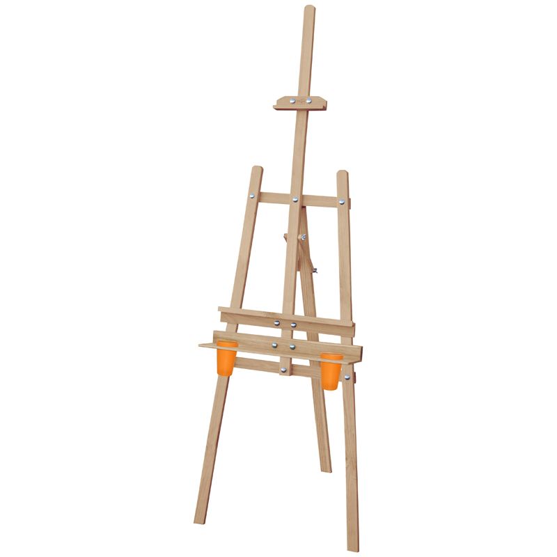 Верхний фиксатор и полка мольберта легко регулируются с помощью барашковых винтов. Напольный мольберт оснащён дополнительной съёмной полкой с двумя стаканчиками для воды или кистей.
