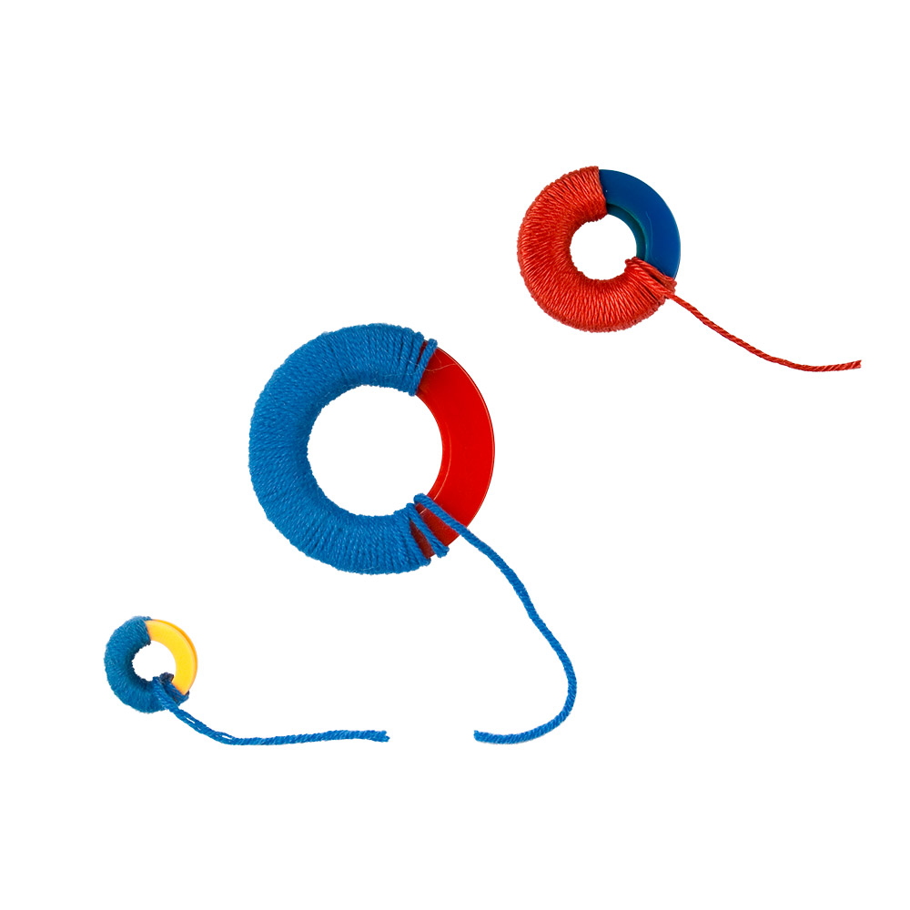 - Обмотайте совмещенные части шаблонов нитями вокруг, по всему диаметру, более или менее плотно, в зависимости от желаемой толщины помпона.