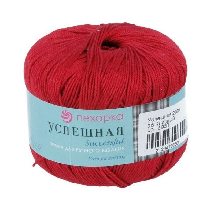 "Успешная" — это пряжа из 100% мерсеризованного хлопка, чьи природные свойства были улучшены с помощью итальянской технологии производства. Нить плотная, крепкая и очень качественная. Изделия из нее хорошо держат форму, не деформируются и сохраняют живой блеск после стирки. Пряжа универсальна для вязания спицами, крючком и на машинке, однако она особенно хорошо раскрывается при работе крючком, который позволяет создавать более четкий рисунок.