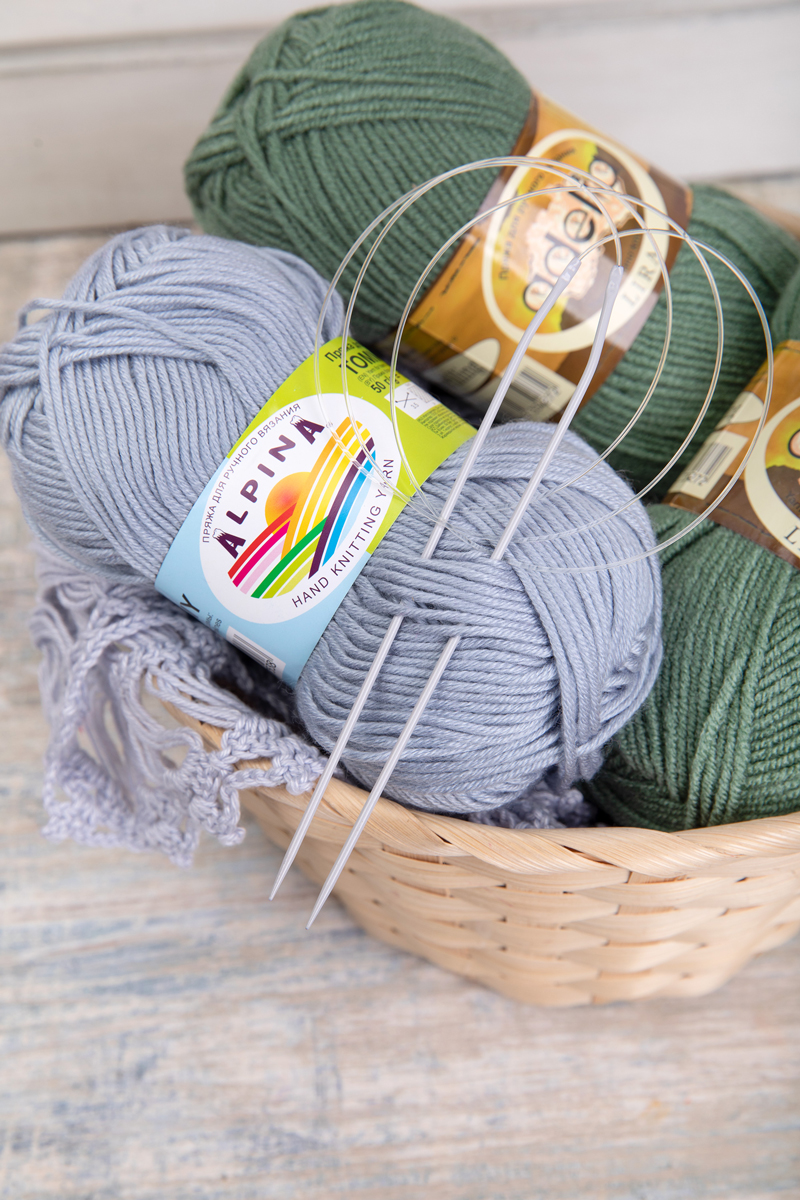 - Назначение: используются для вязания круглых и плоских изделий. Короткими спицами вяжут бейки горловины и воротники-гольф, а длинными можно вязать целые модели по кругу.