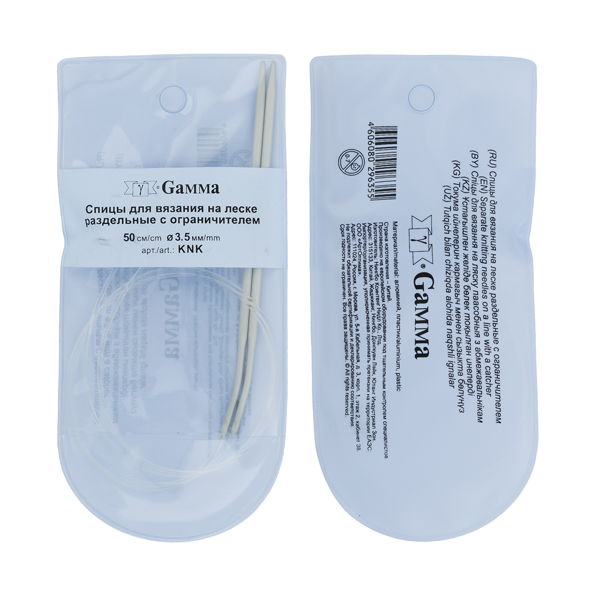 Спицы раздельные на леске "Gamma" KNK — это специальный вид спиц для вязания, состоящий из двух отдельных длинных спиц, соединенных гибким кабелем или леской. Они обеспечивают удобство при вязании круглых и трубчатых изделий.