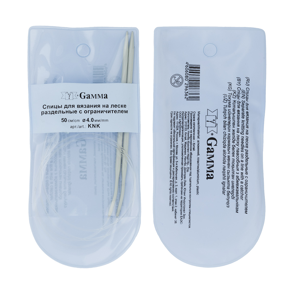 Спицы раздельные на леске "Gamma" KNK — это специальный вид спиц для вязания, состоящий из двух отдельных длинных спиц, соединенных гибким кабелем или леской. Они обеспечивают удобство при вязании круглых и трубчатых изделий.
