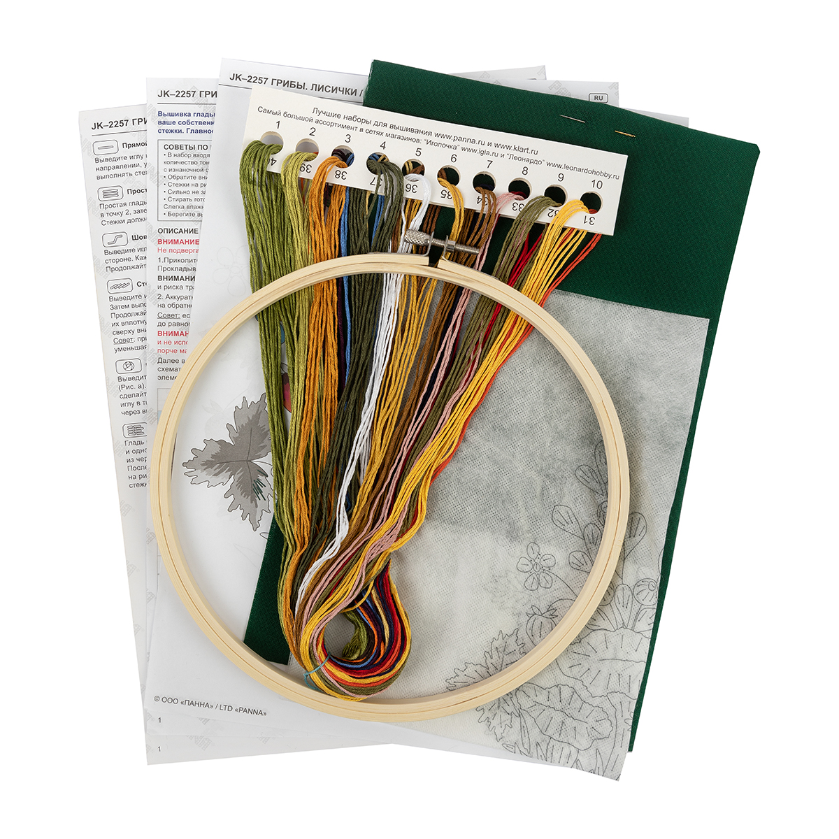 хлопковая ткань, водорастворимый флизелин с напечатанным контуром, хлопчатобумажные нитки мулине Gamma на держателе, деревянные пяльцы, игла для вышивания Gamma, подробная инструкция по вышиванию с цветными иллюстрациями