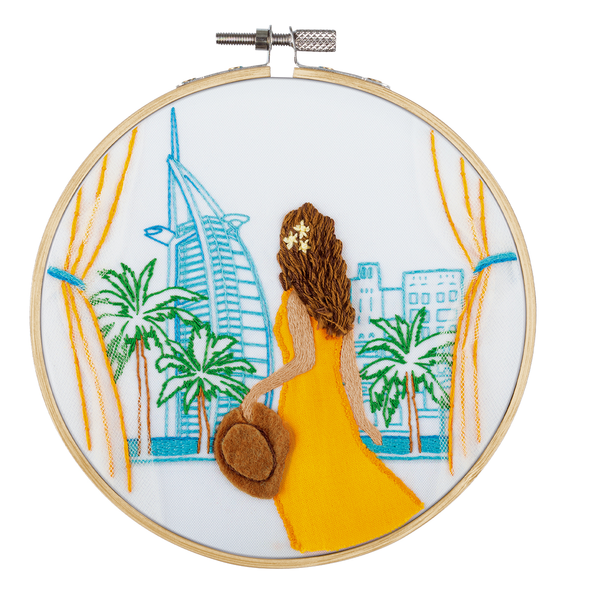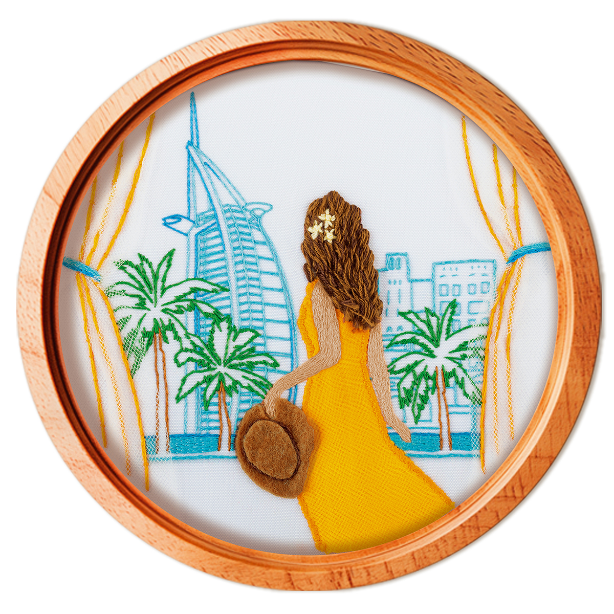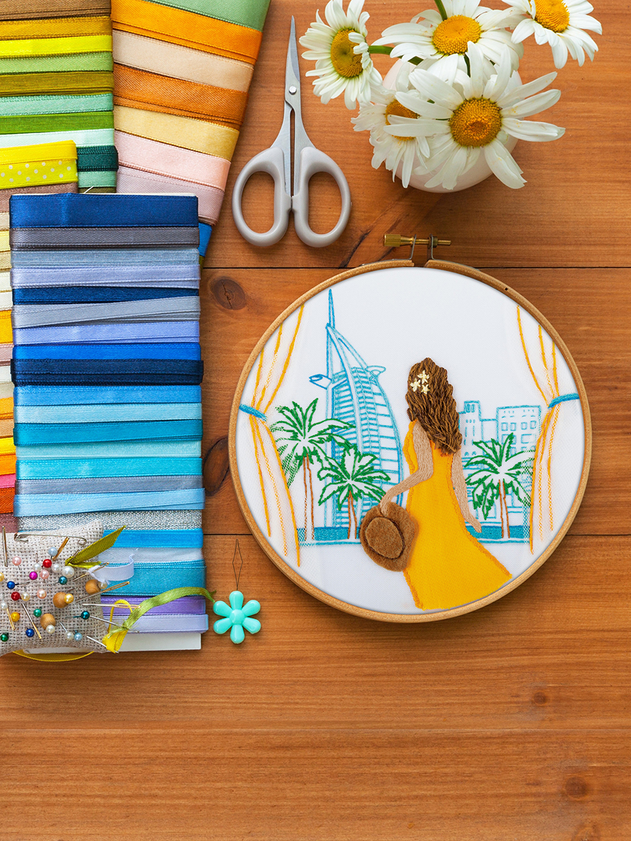 ткань с напечатанным рисунком, хлопчатобумажные нитки мулине Gamma, деревянные пяльцы, фетр, фатин, хлопоковая ткань, игла для вышивания Gamma, подробная инструкция по вышиванию
