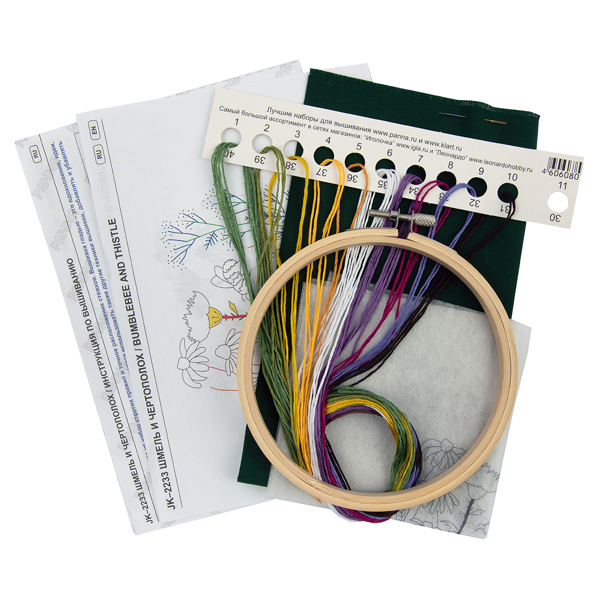 хлопковая ткань, водорастворимый флизелин с напечатанным контуром, хлопчатобумажные нитки мулине Gamma на держателе, деревянные пяльцы, игла для вышивания Gamma, подробная инструкция по вышиванию с цветными иллюстрациями
