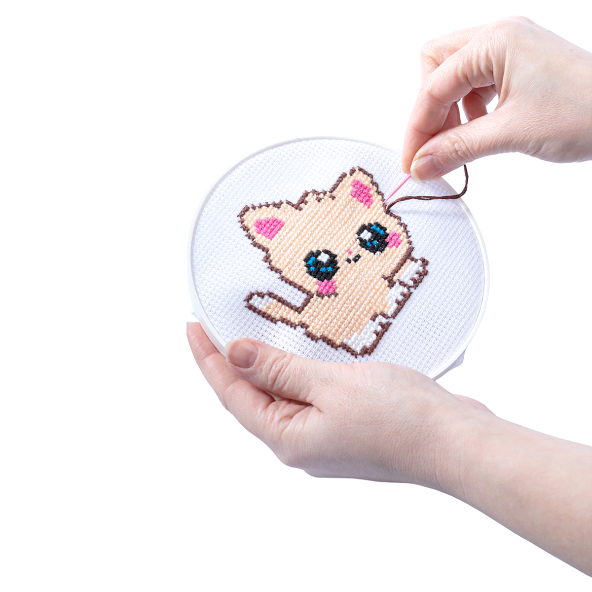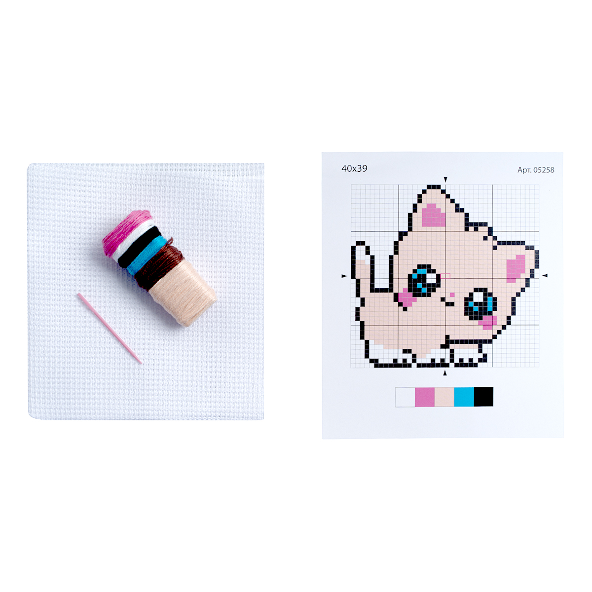игла пластиковая 4.8 см, белая канва 25 х 25 см, нитки мулине 6 цветов (белый, черный, бежевый, коричневый, розовый, голубой), цветная схема вышивки, пяльца пластиковые (диаметр 15 см)