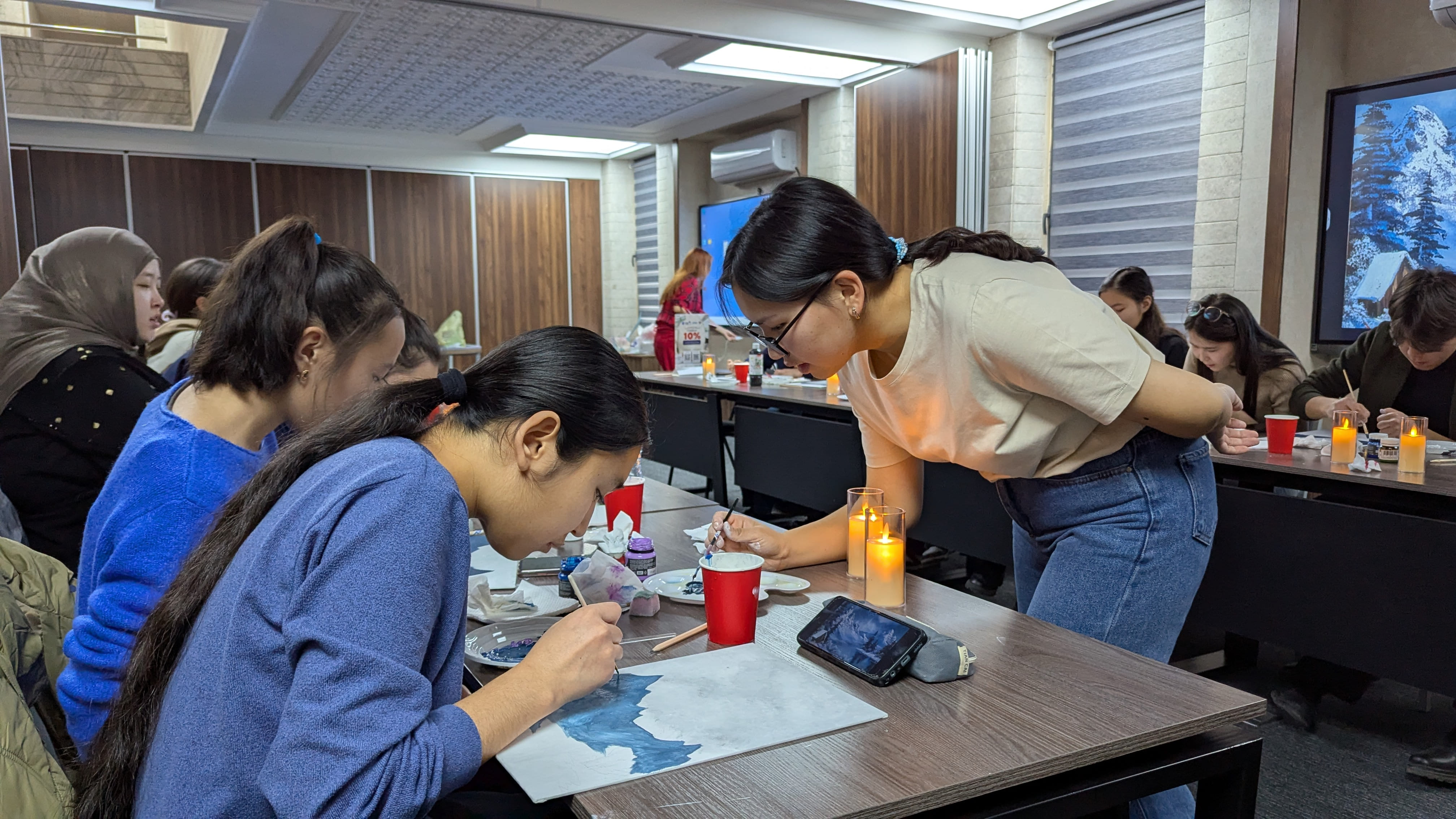 Мероприятие состоялось в тёплой и творческой атмосфере. Участники создавали картины, вдохновляясь зимними мотивами и приближающимся Новым годом, пробуя разные художественные приёмы и техники.